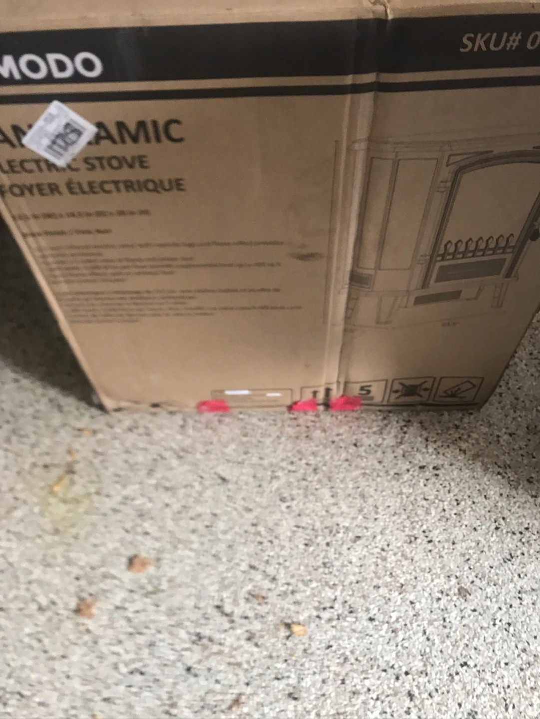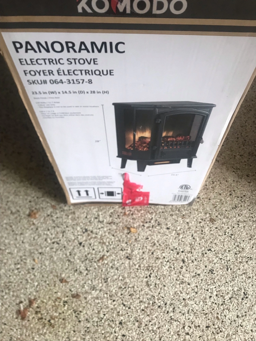 New in box. Electric stove with realistic flame effect. Compact size, ideal for smaller spaces. SKU# 064-3157-8. Dimensions: 23.5 in (W) x 14.5 in (D) x 28 in (H).