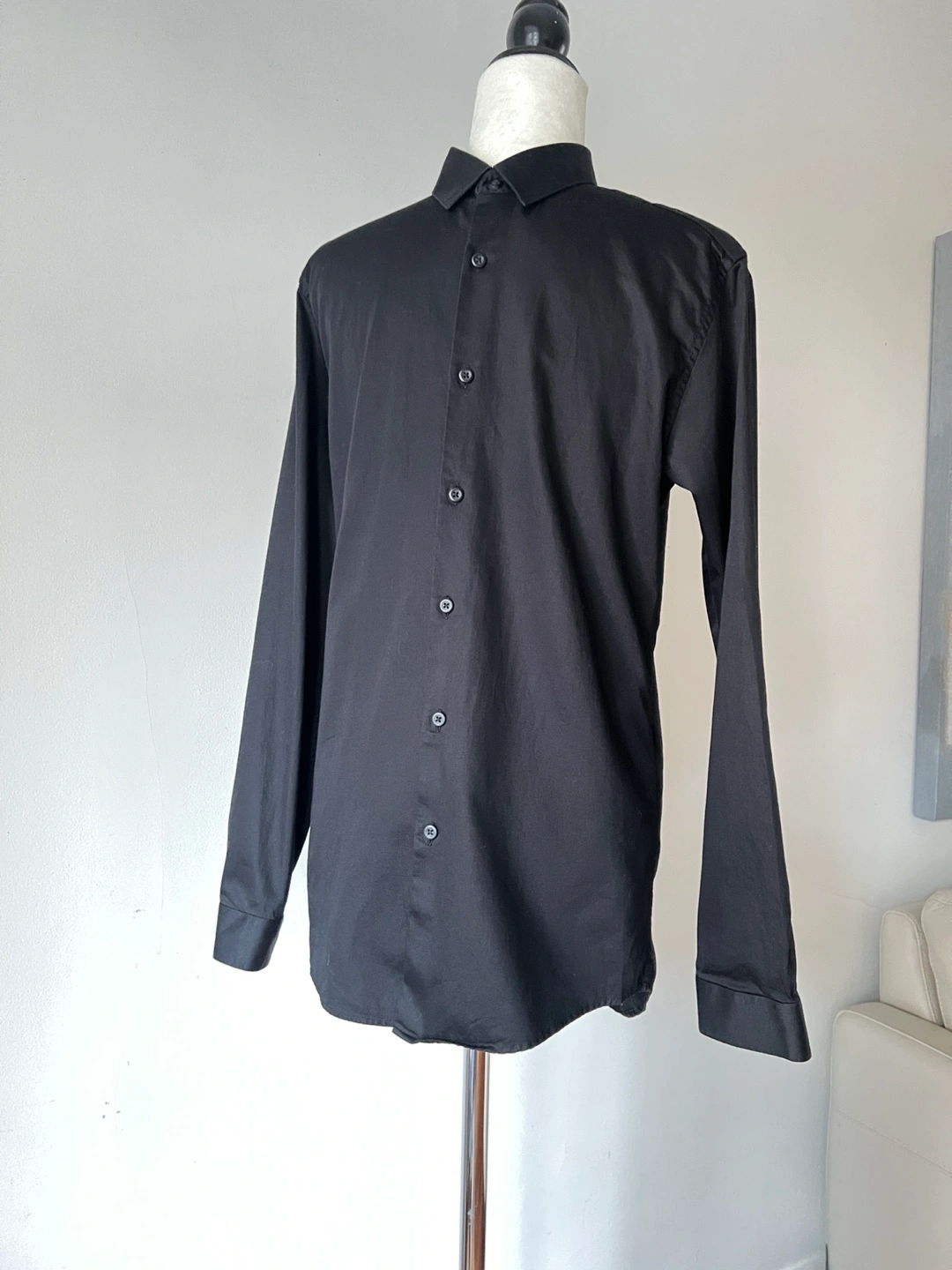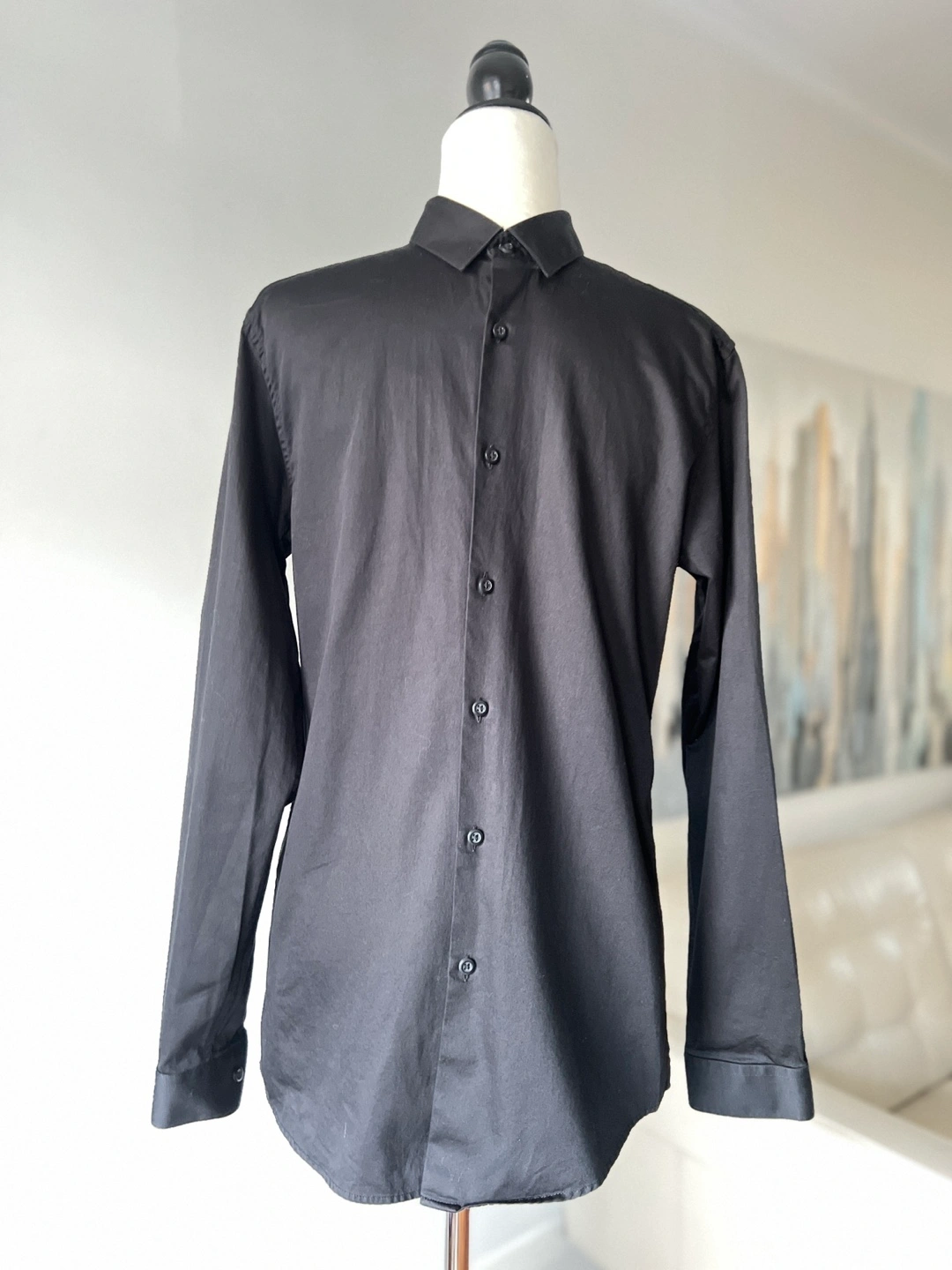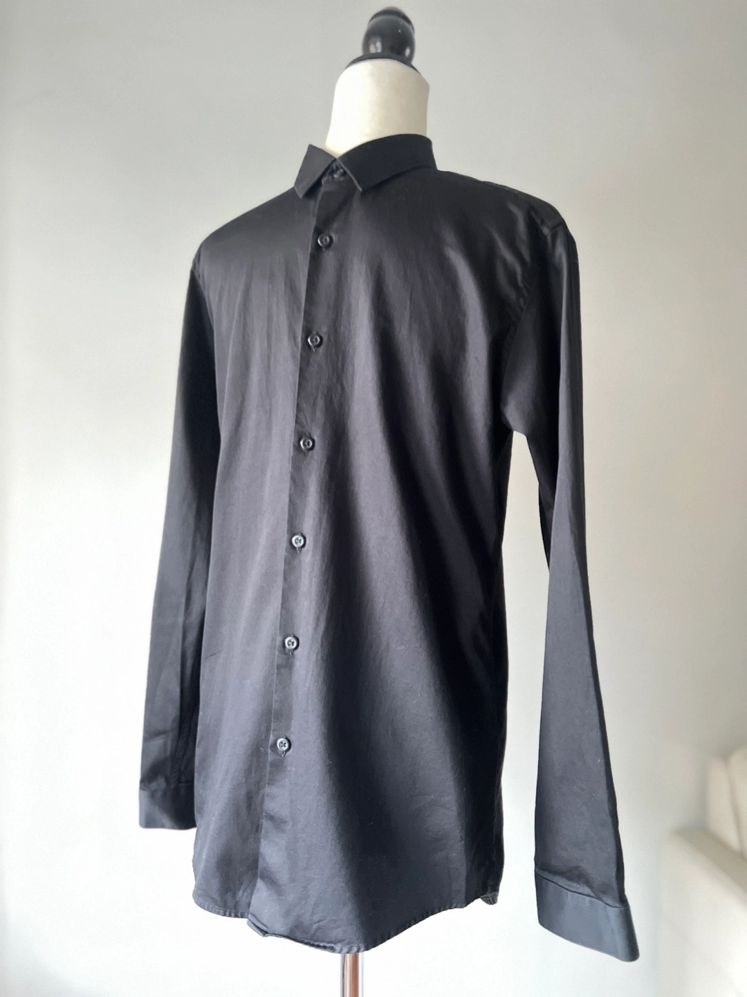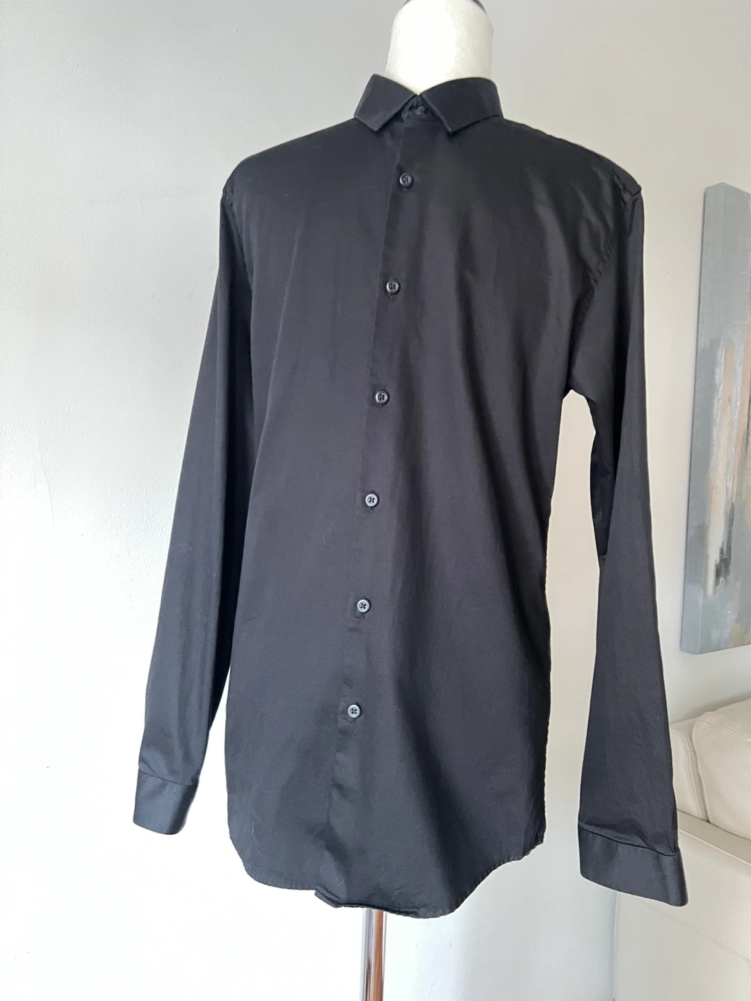 2 shirts for $30 (see my listings for the other men’s shirts I’m selling). Men’s Topman Premium Egyptian Cotton button-down shirt. Long sleeves, black colour with an elegant sheen. Perfect for any occasion. Slim fit with stretch.