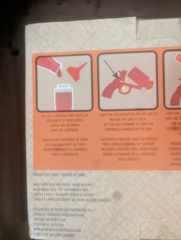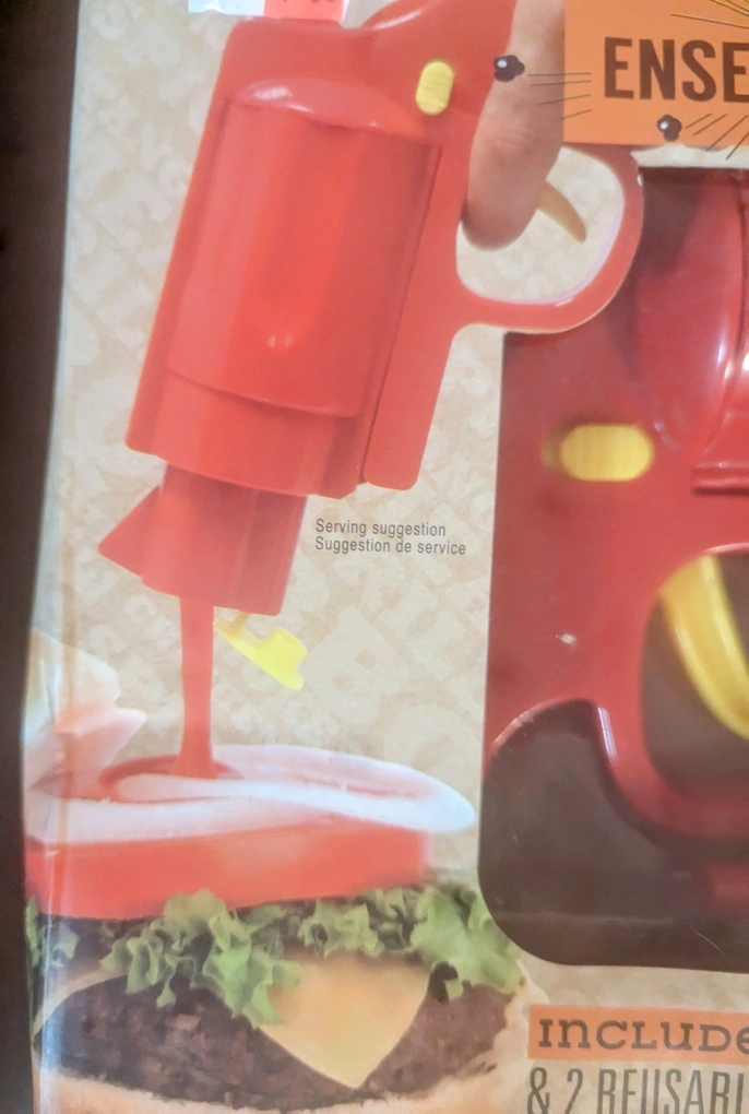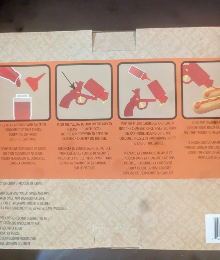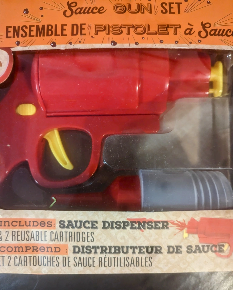 Fun kitchen gadget. Includes sauce dispenser and two reusable cartridges. Great for parties, s we uirting mustard, or ketchup .