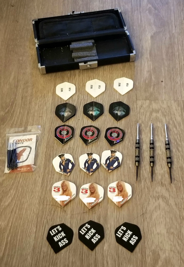 Complete darts set. Includes multiple sets of flights with various designs, a carrying case, and Condor shafts. Great for players of all skill levels.