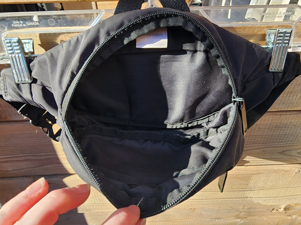 Medium size fanny pack/waist bag. Used as a sling (cross body) bag as well. Adjustable strap. Features three off-white stripes. Zipper closure. Zippers are in great condition. One main compartment – one small front compartment.