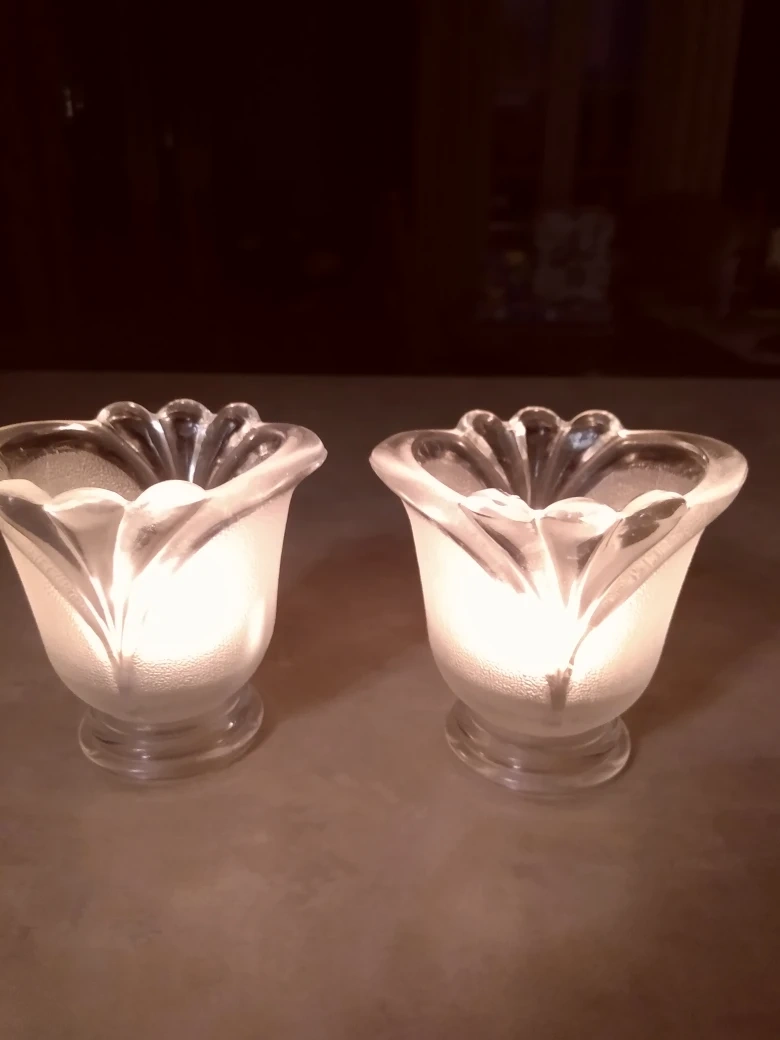 Beautiful pair of glass votive candle holders. Elegant floral design. Perfect for adding ambiance to any room.