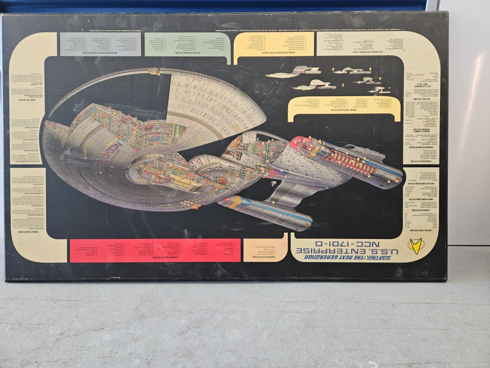 Vintage Star Trek poster. wood. Detailed cutaway diagram of the USS Enterprise-D. Includes ship schematics and technical specifications. Great for collectors.