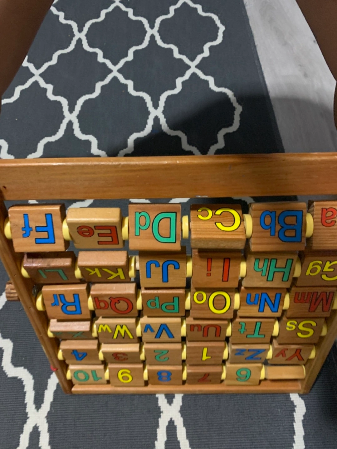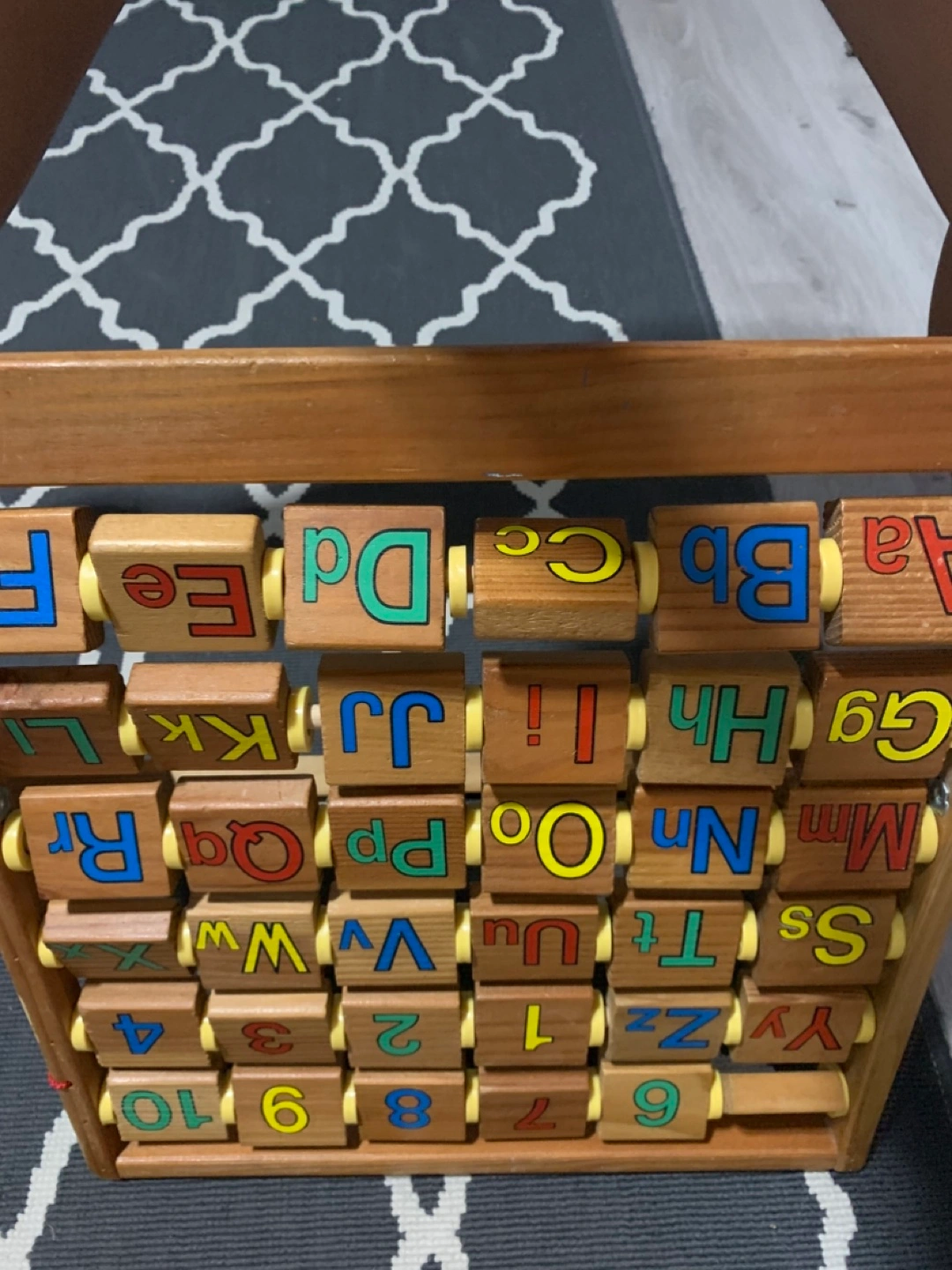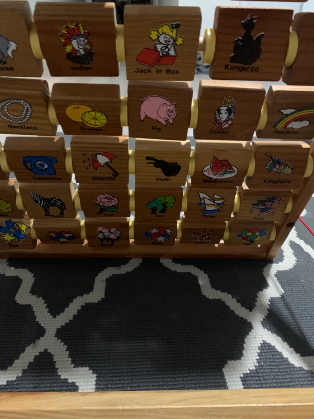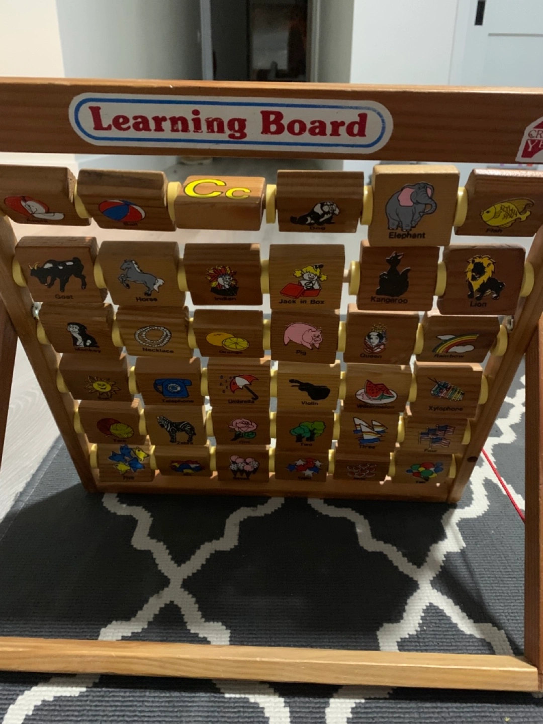 Educational toy. Features alphabet, numbers 1-10, and pictures of various objects. Wooden construction. Great for preschoolers.