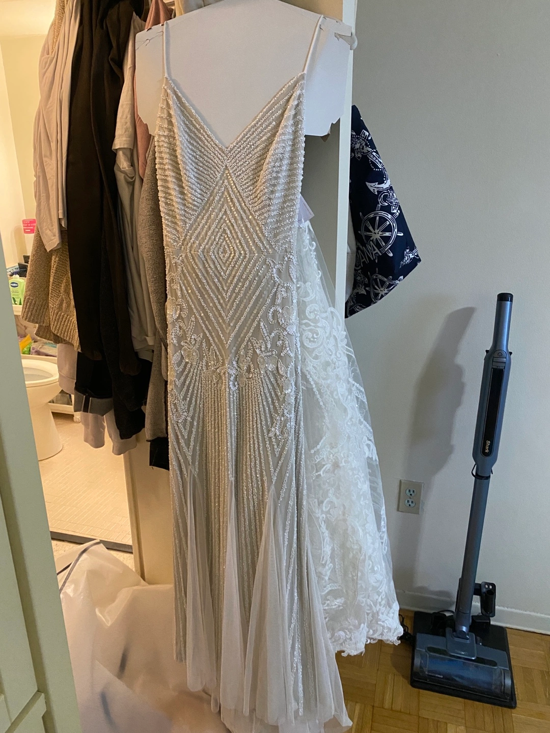 Gorgeous beaded sheath dress. V-neck, sleeveless. Features beautiful beading and godet details. Floor-length. Perfect for a special occasion. Altered in height but not used.