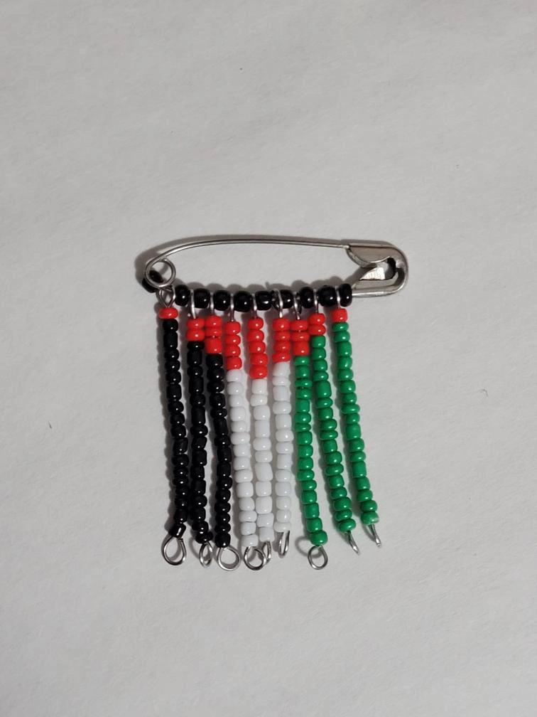 41Handmade beaded safety pin brooch. Features black, red, white, and green seed beads. Small and lightweight. Unique design. BINGO