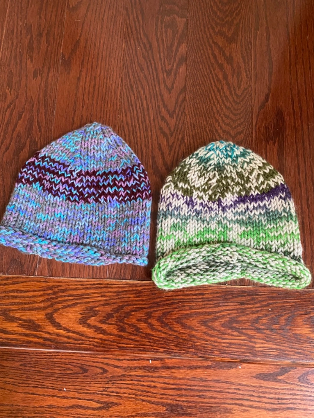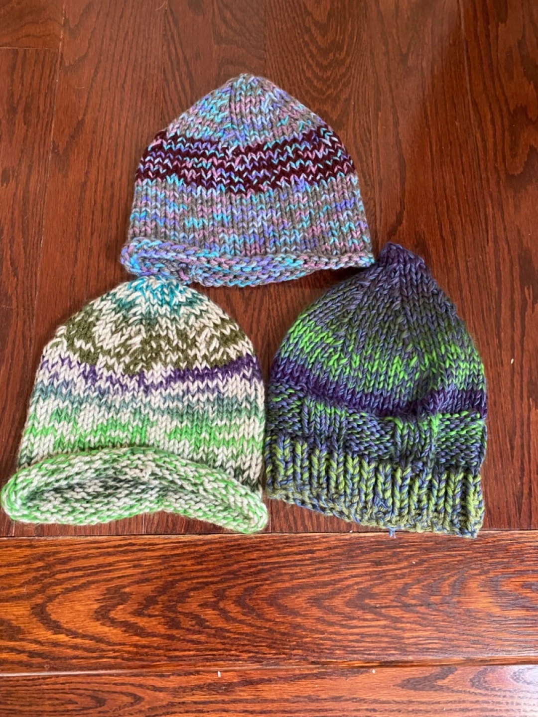 507Three unique hand-knitted beanies. Variety of colours and patterns. Cozy and warm for winter. Perfect for gifting or personal use. Cash only