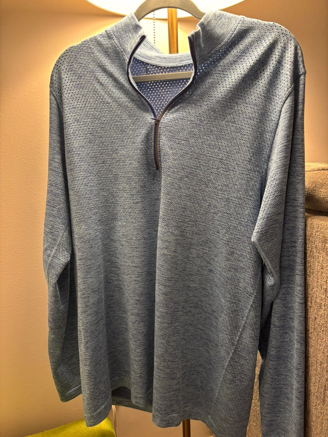 150Lululemon men's athletic shirt. Half-zip, long sleeves. Light blue heather colour. Moisture-wicking fabric. Great for workouts or casual wear. Smoke and pet free home Bayview and Sheppard main intersection