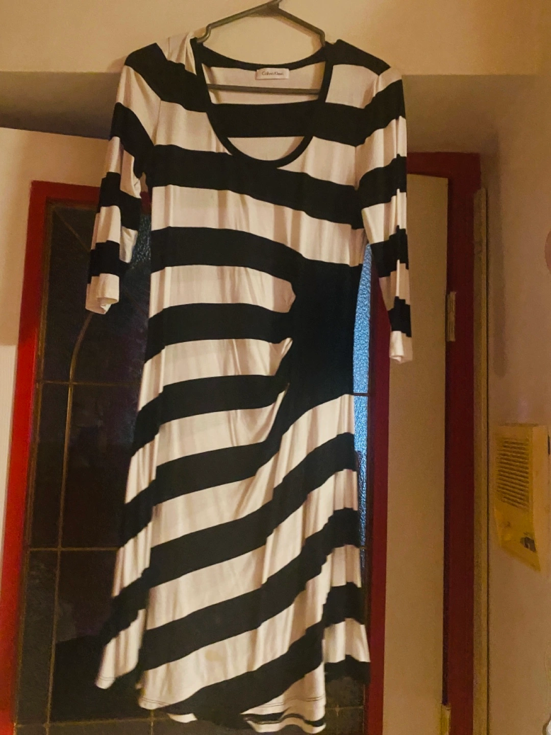 Three-quarter sleeve dress. Black and white horizontal stripes. Relaxed fit. Draped design.