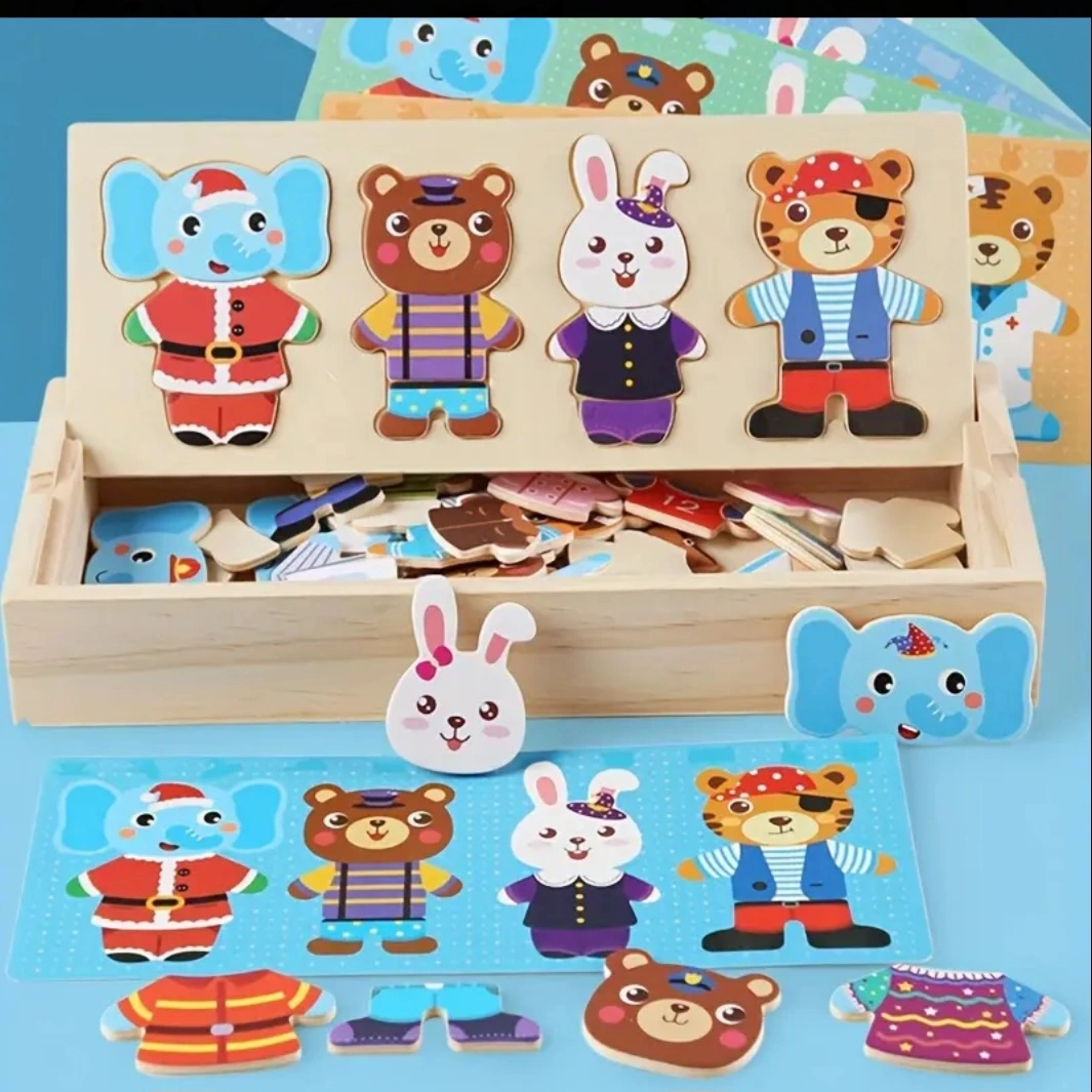 152Adorable wooden puzzle featuring cute animal characters. Includes multiple clothing pieces to match. Great for developing fine motor skills and problem-solving abilities. Comes in a convenient wooden storage box. Matching cards included for extra play.