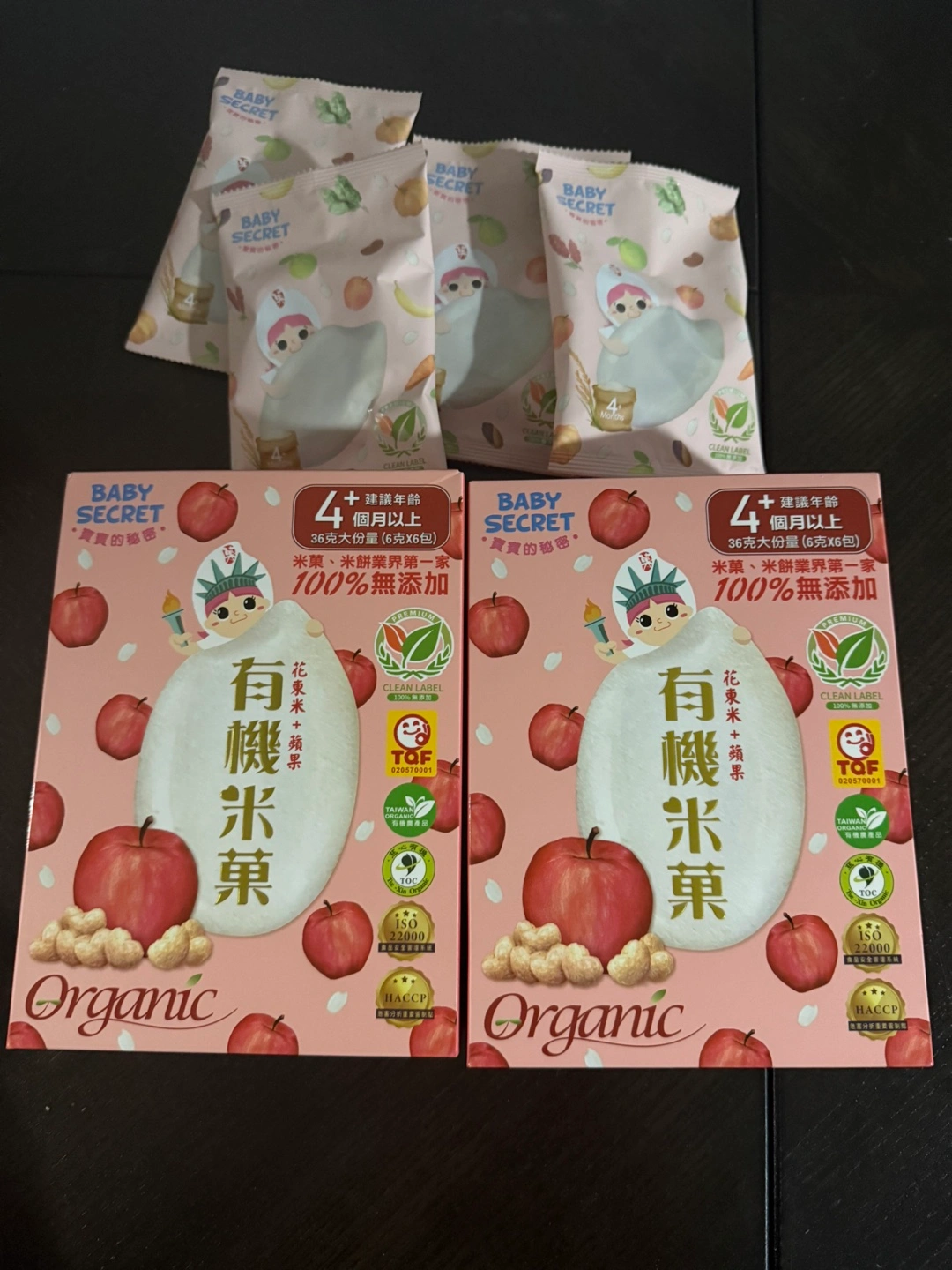 Two full boxes of Baby Secret Organic Apple Rice Crackers and 4 individual packets
