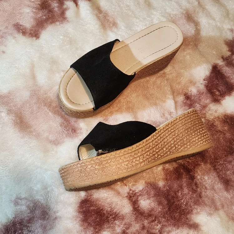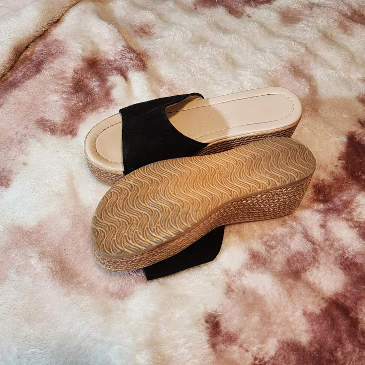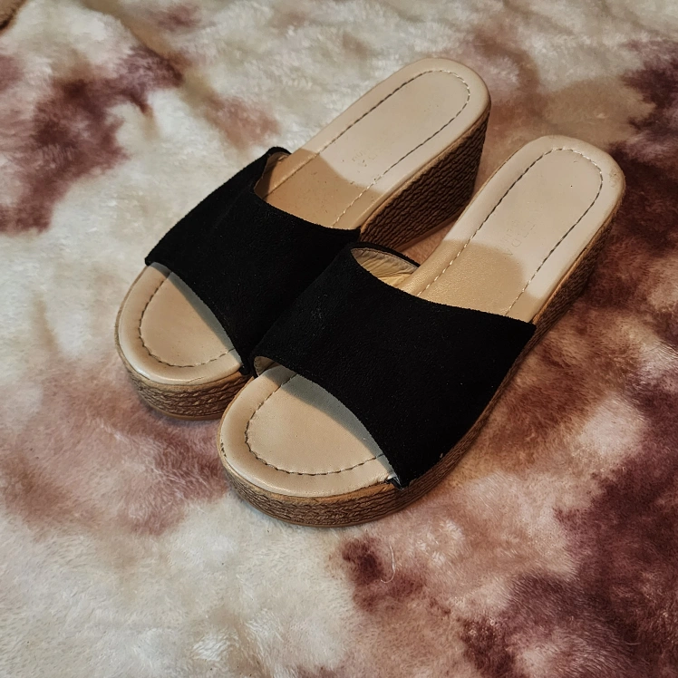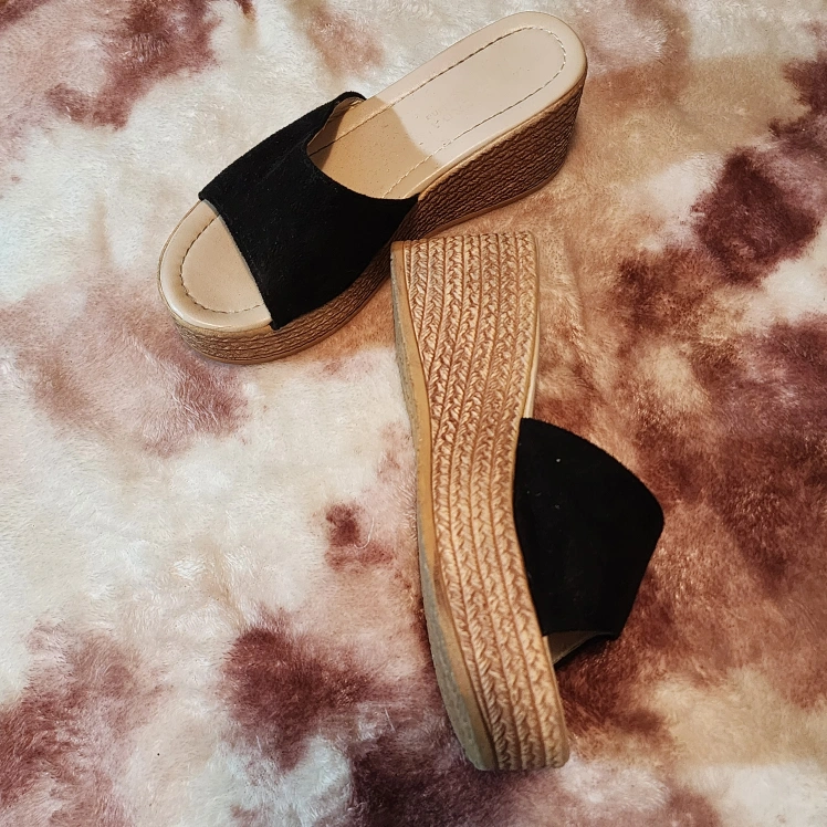 199Pair of black suede wedge sandals. Open toe design. Beige insole. Scuff on the outer left sandal. In good condition otherwise, minimal wear.