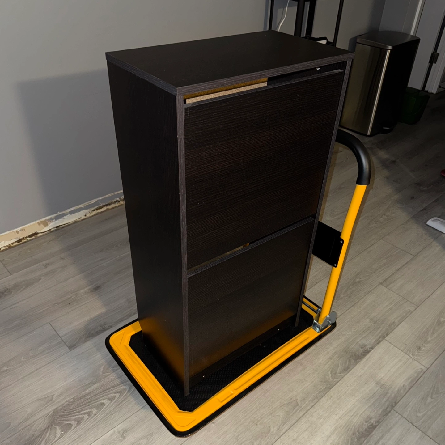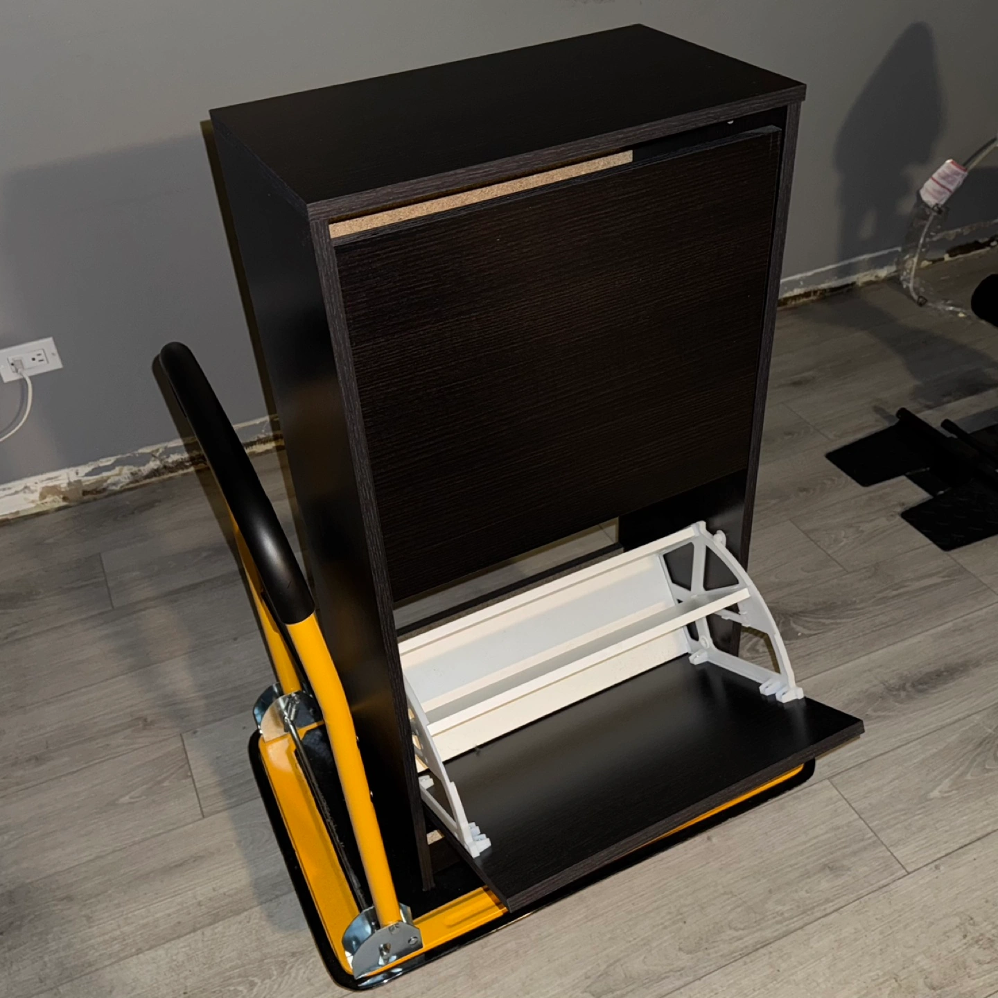 Shoe storage solution. Two pull-out shelves. Dark brown finish. Compact design. Ideal for entryways or closets. Lightweight easy to move around.