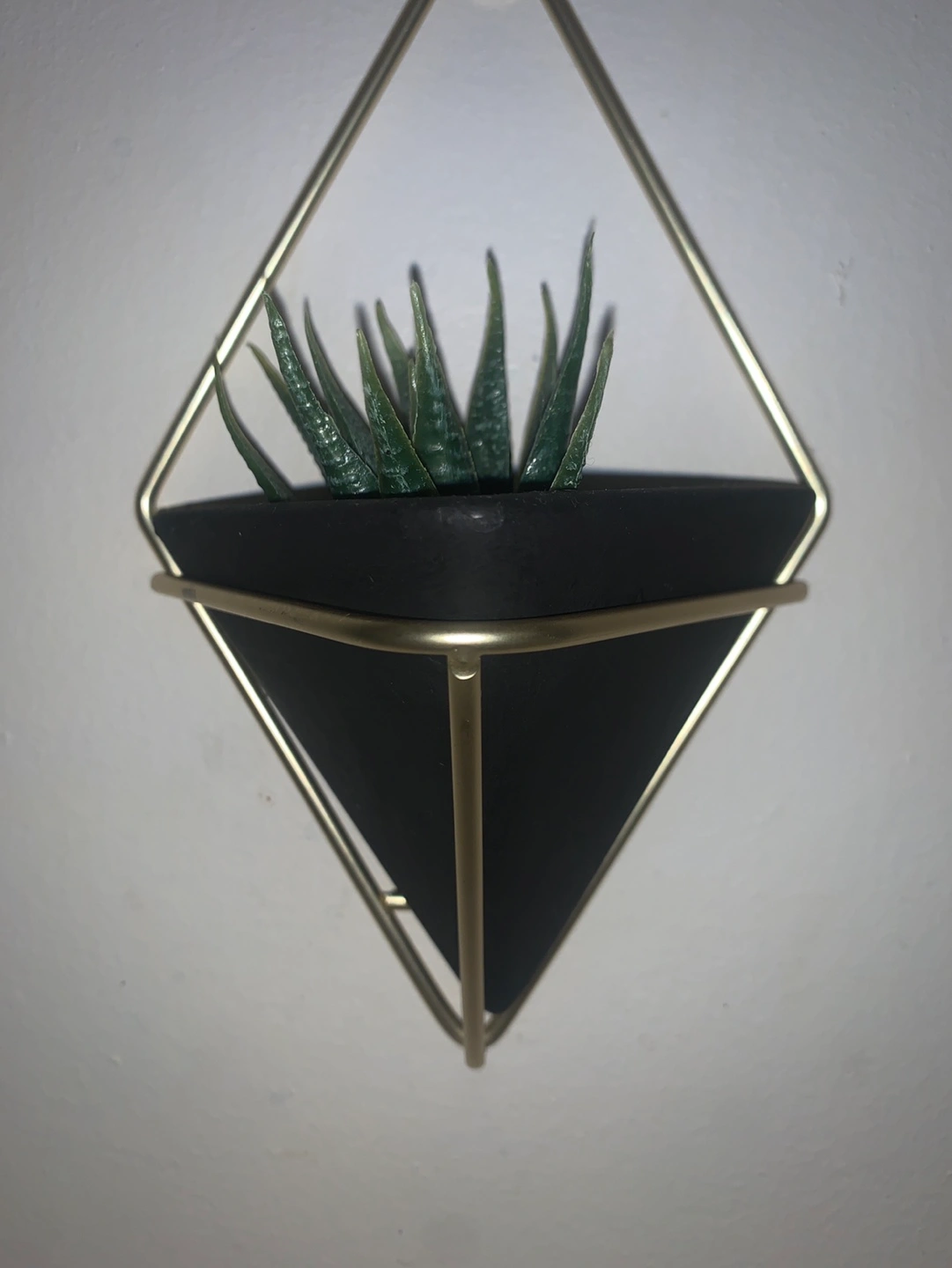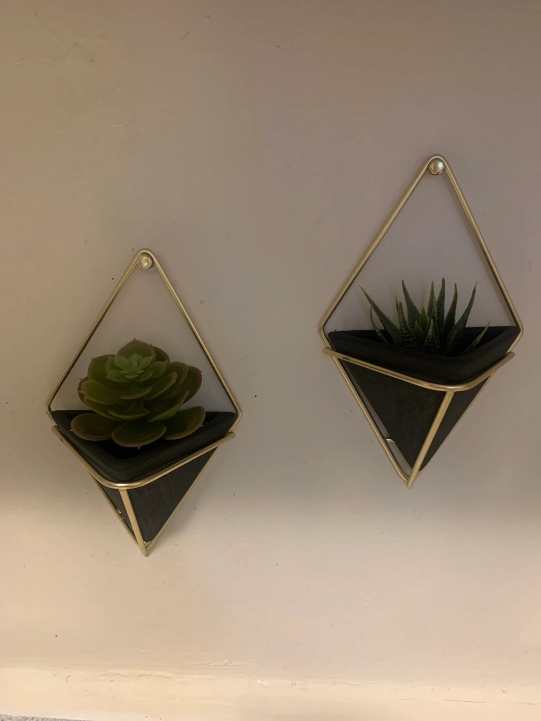 Modern geometric design. Black matte triangular pots. Gold metal frame. Includes two faux succulents. Perfect for minimalist decor.