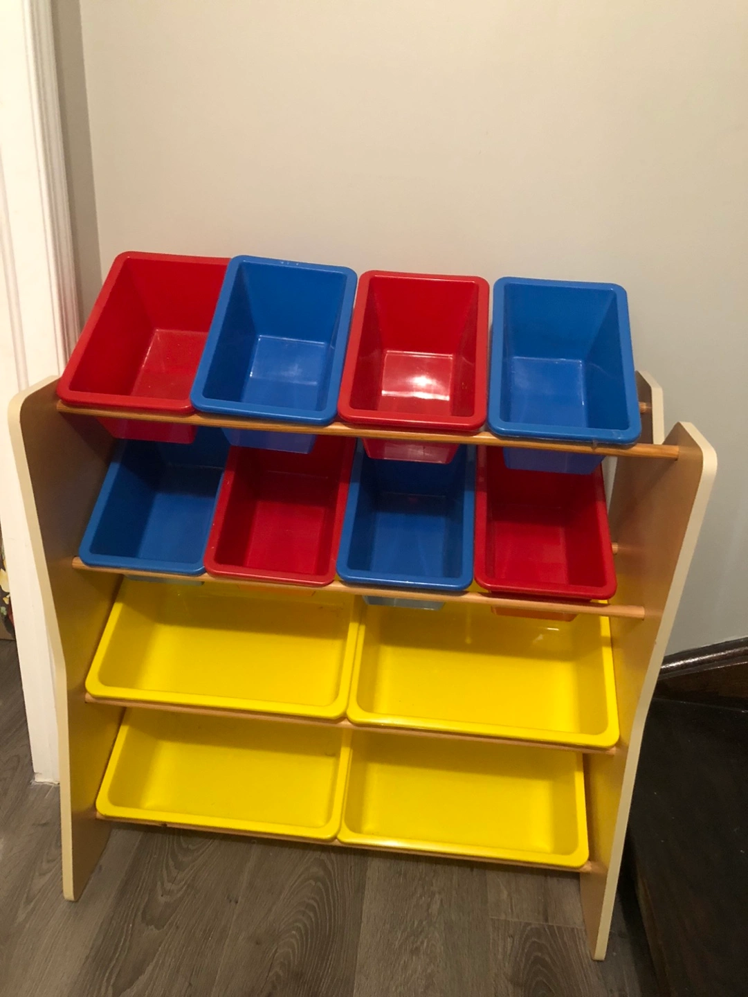 627Wooden toy organizer. 12 colourful plastic bins. Four shelves. Great for storing toys or other items. Used, great condition. Asking $40 Pick up in Pickering (Altona & Kingston).