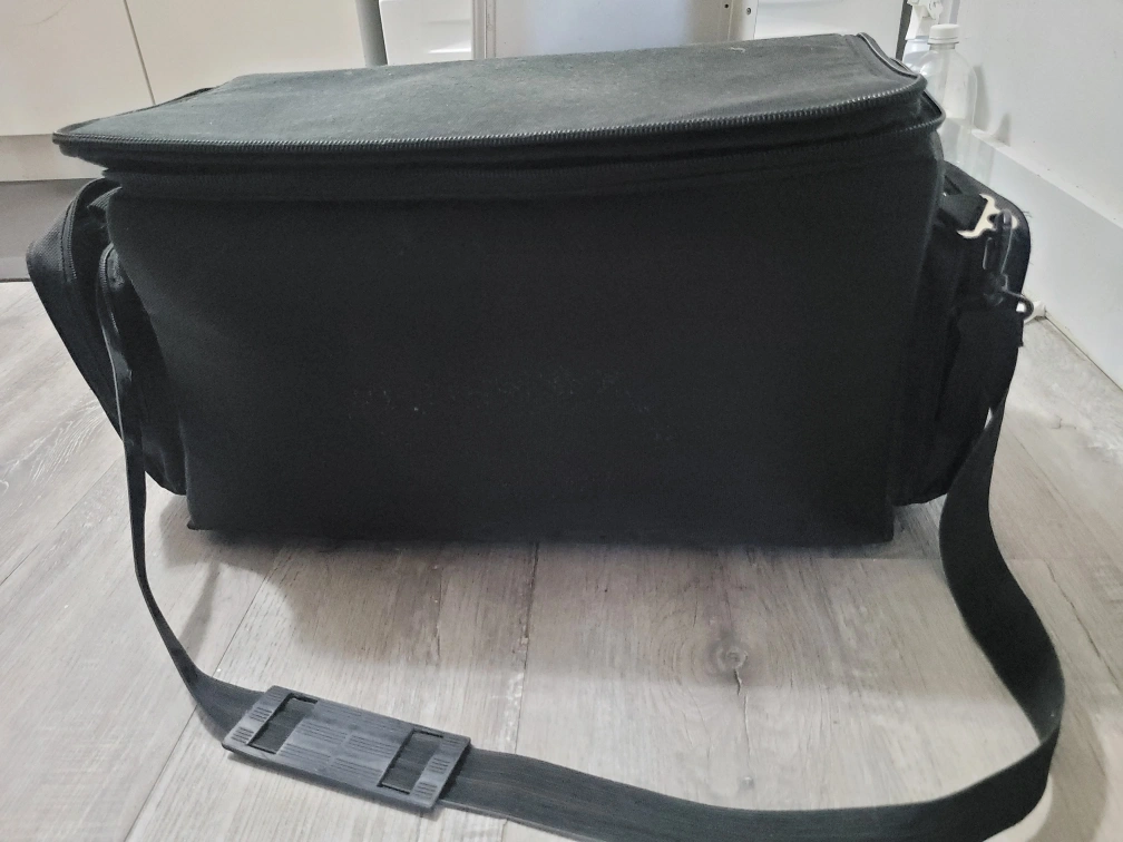 Measures 48cm(wide) x 28cm(lenght). Black padded carrying case. Features a zipper closure and long adjustable shoulder strap. Interior is lined with soft, padded material, including both side pockets for transporting delicate items, such as cameras and filming, podcasting equipment, etc Also 1 slim pocket in the back(last photo), ideal for a small laptop, tablet or notebook.