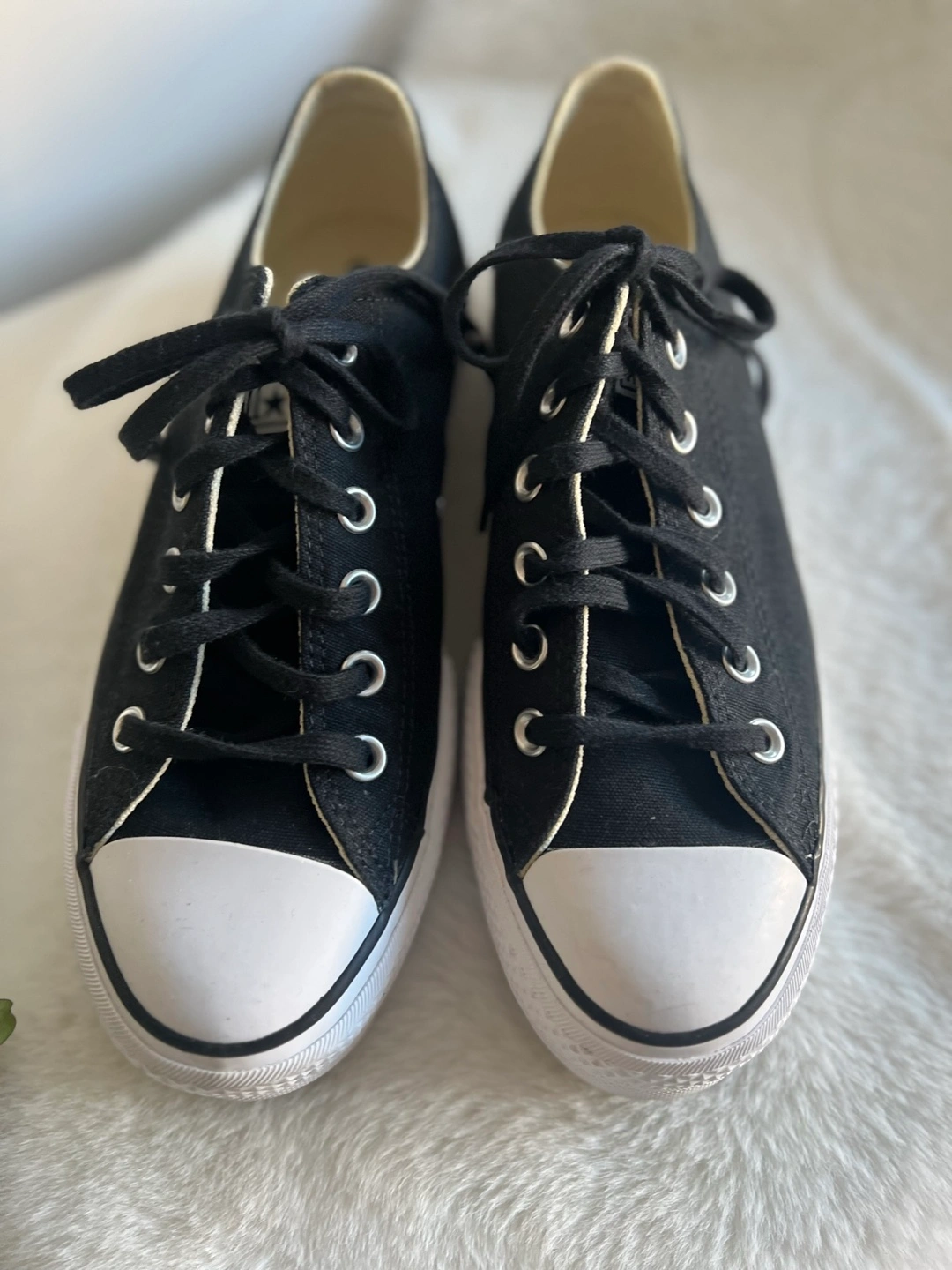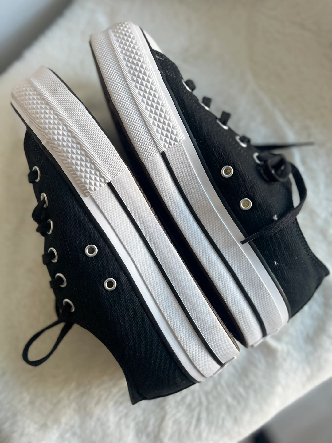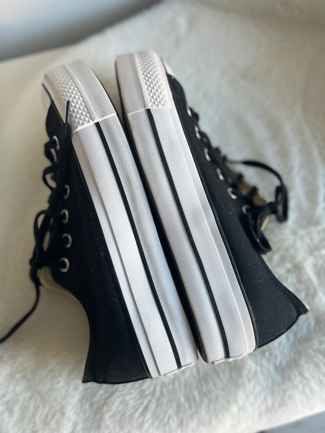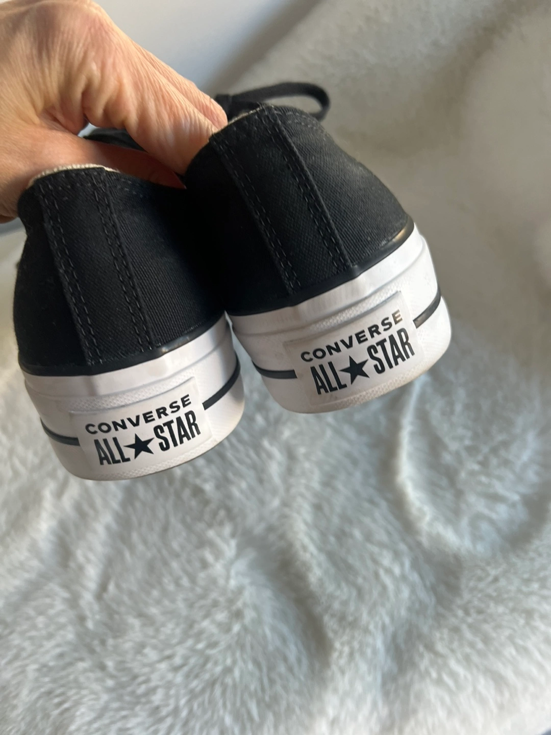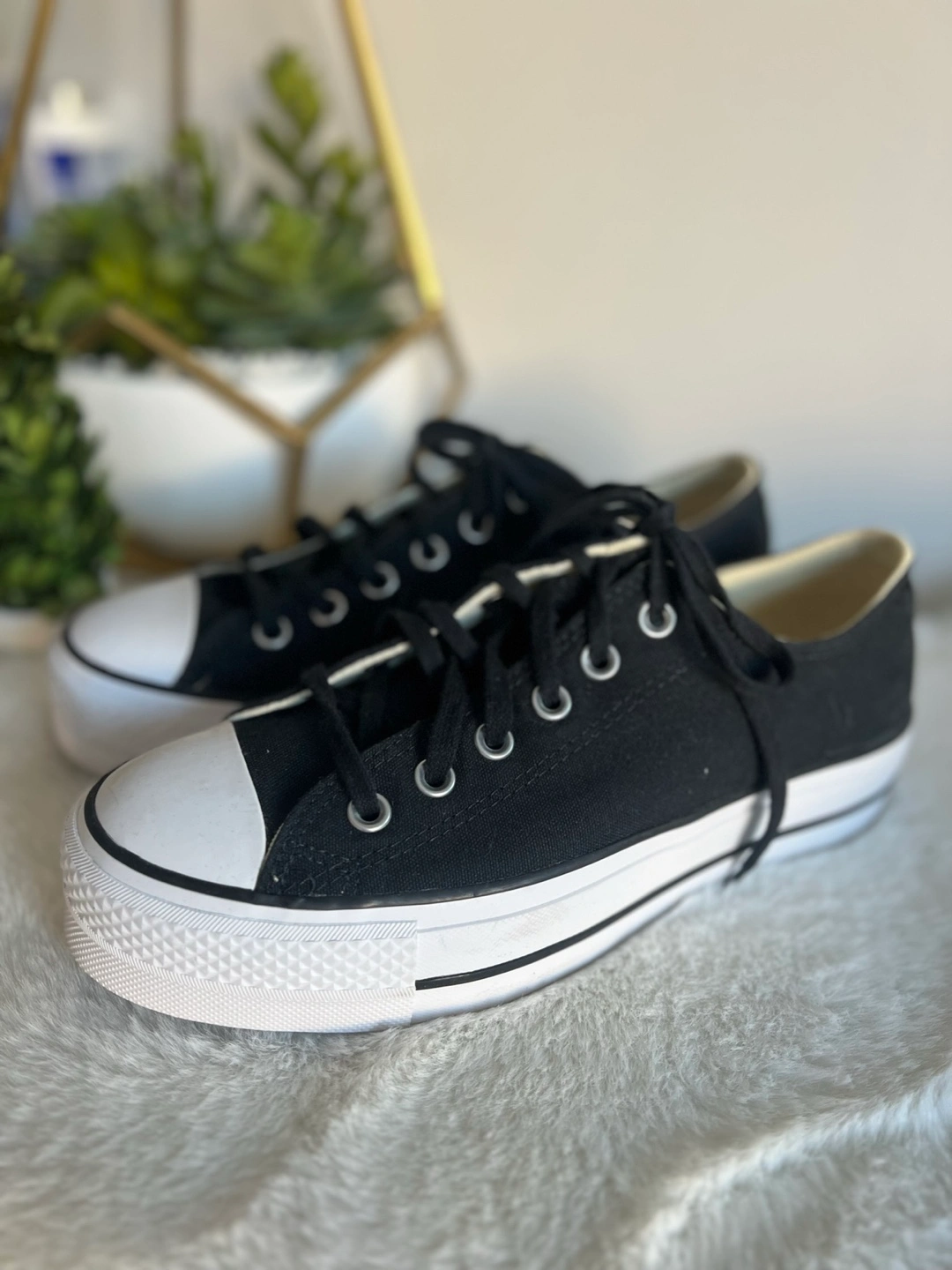 Brand new black platform lift Converse All Star low top sneakers. Classic design, canvas upper, white sole. Size 8.5