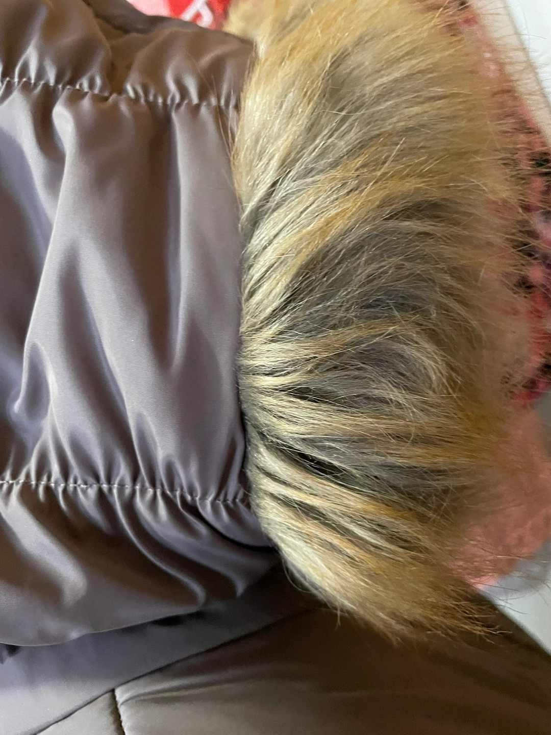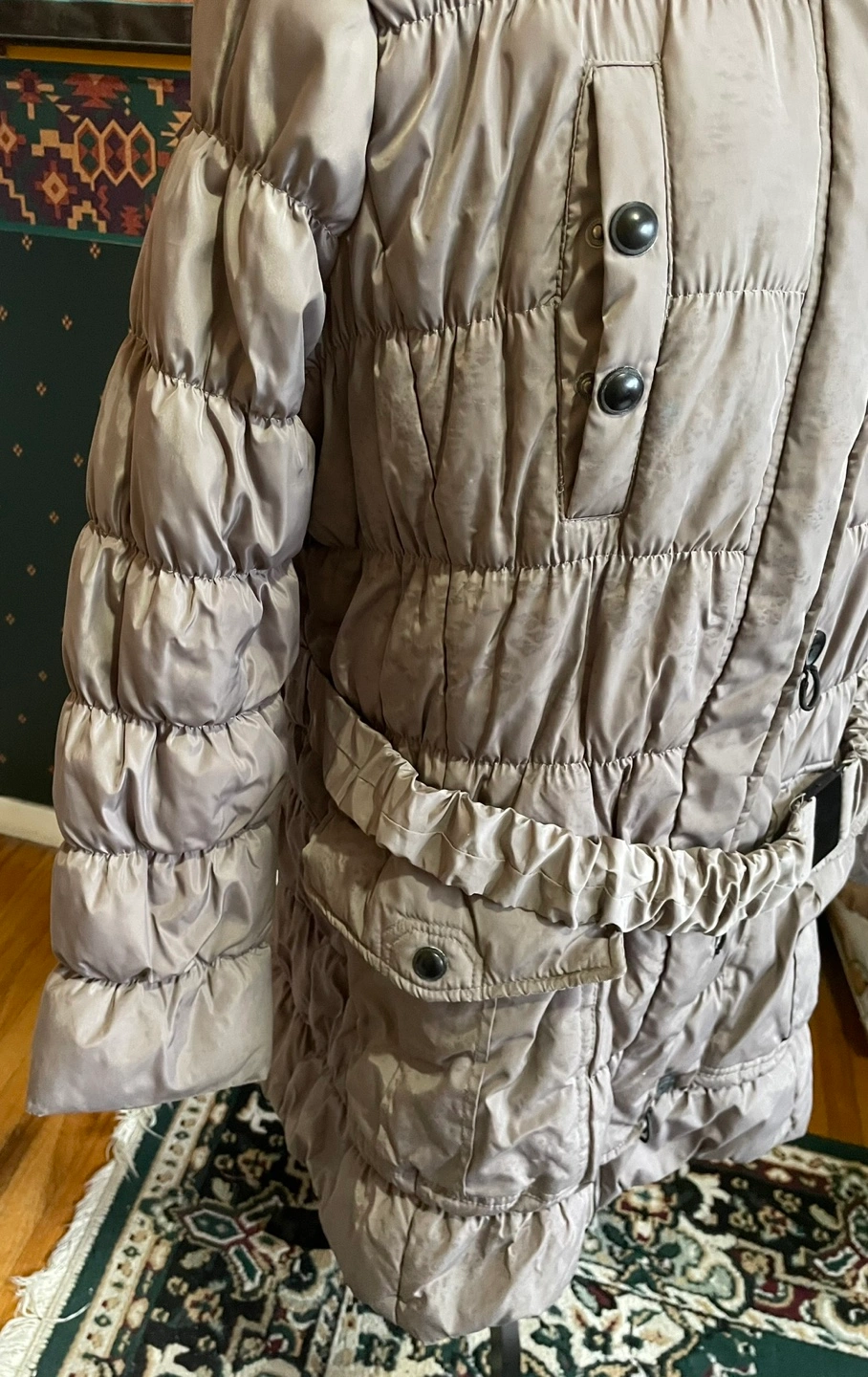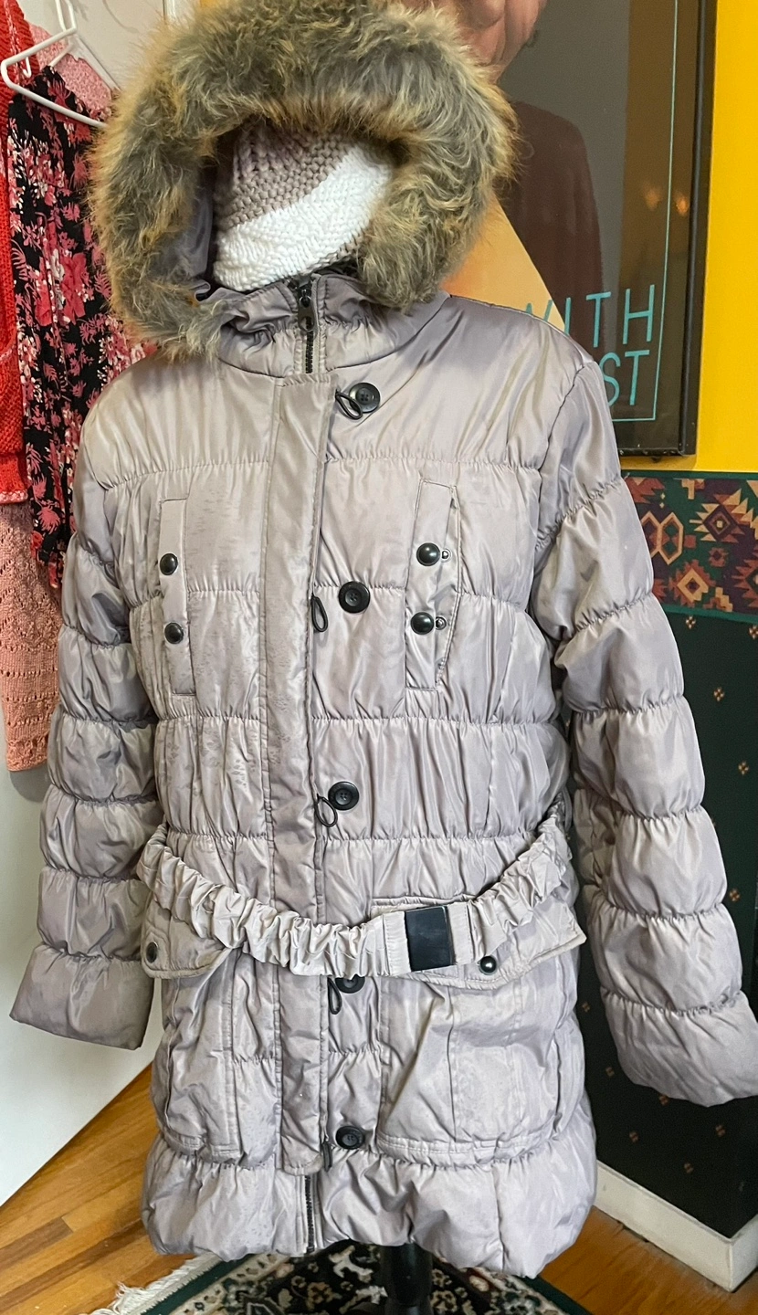 🧡🥕Long-sleeved puffer jacket. Features a faux fur trimmed hood, belted waist, and multiple pockets. Light taupe colour. Washable.