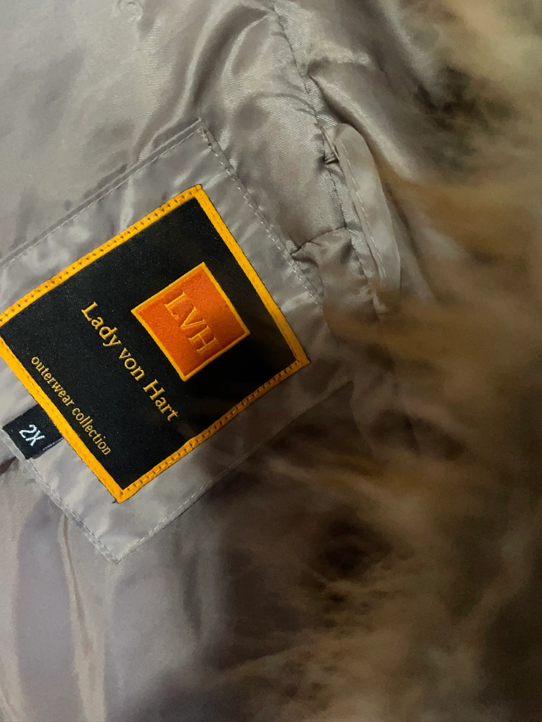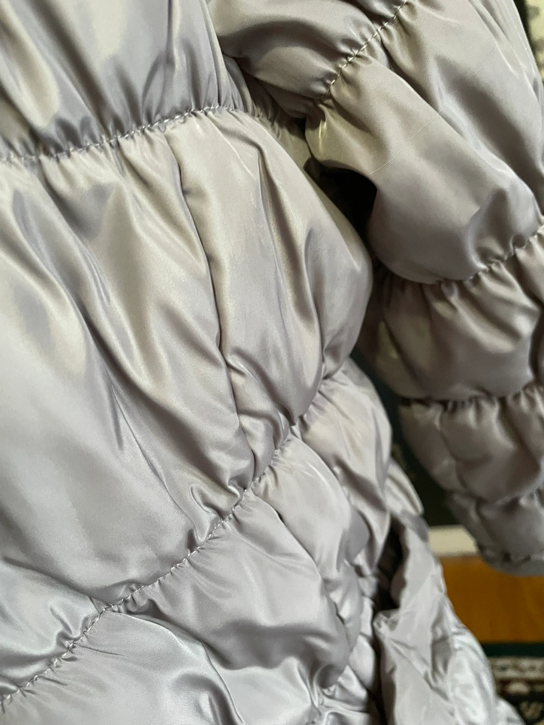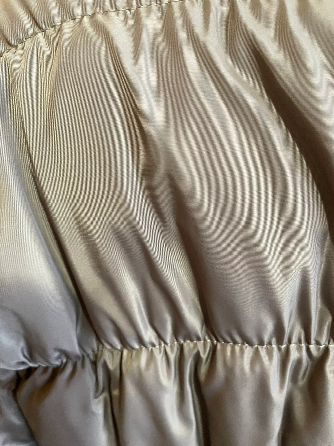 🧡🥕Long-sleeved puffer jacket. Features a faux fur trimmed hood, belted waist, and multiple pockets. Light taupe colour. Washable.