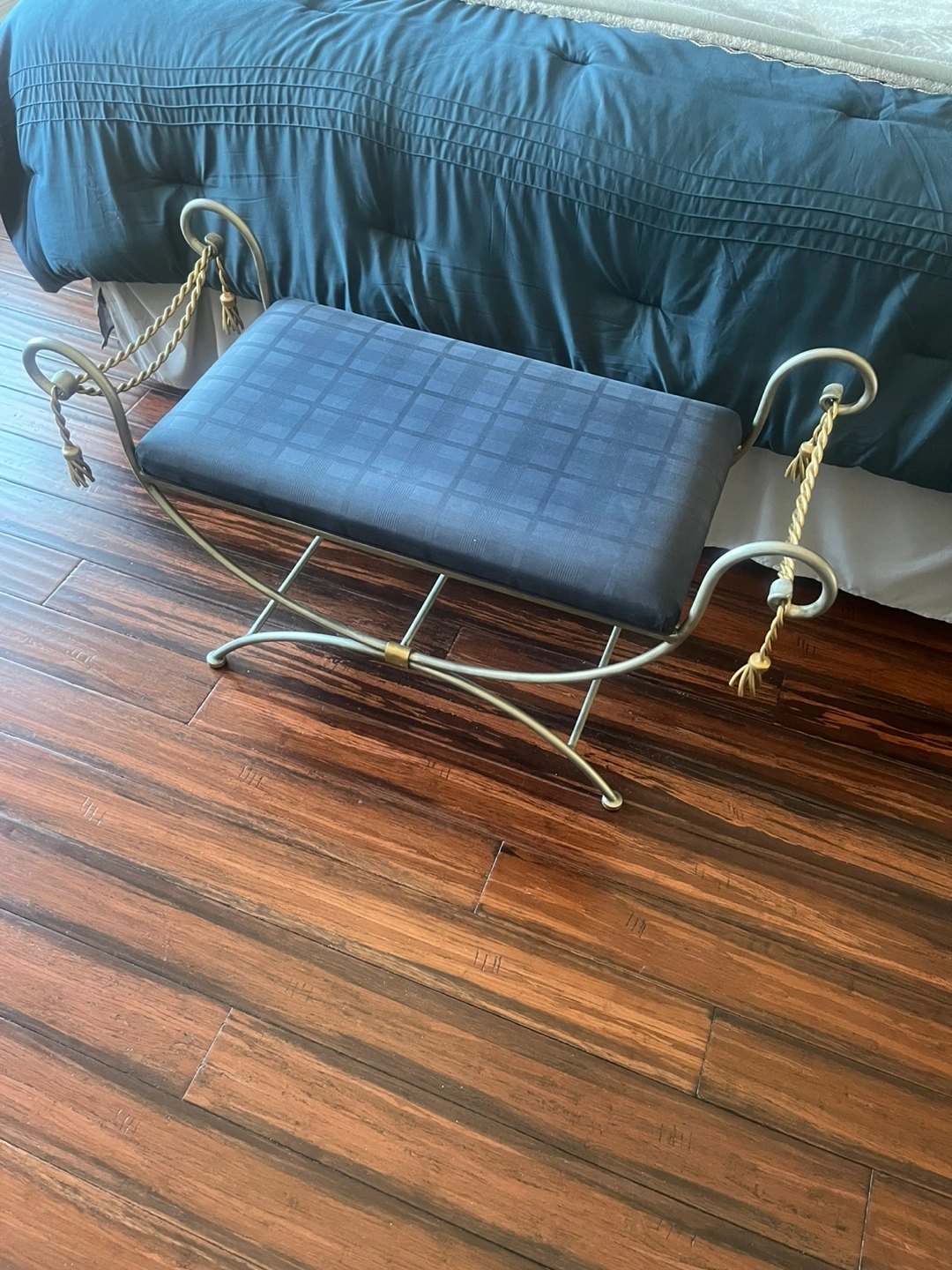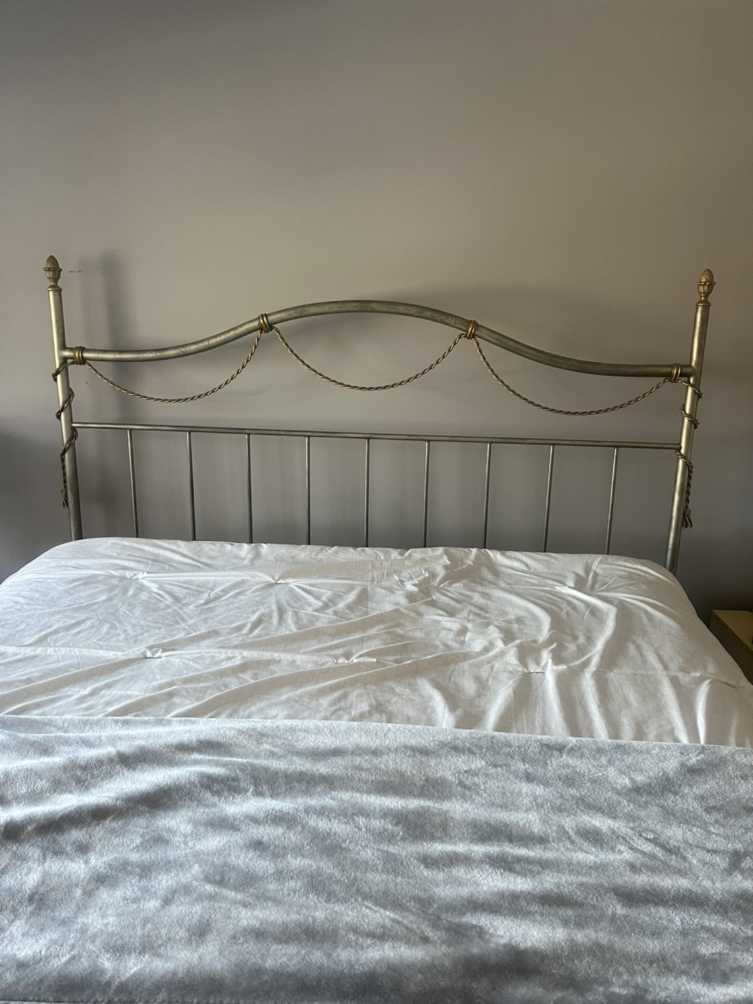 Elegant queen-size headboard and matching bench. Metal frame with rope detailing. Silver and gold tones. Durable and stylish. Perfect for a bedroom upgrade.