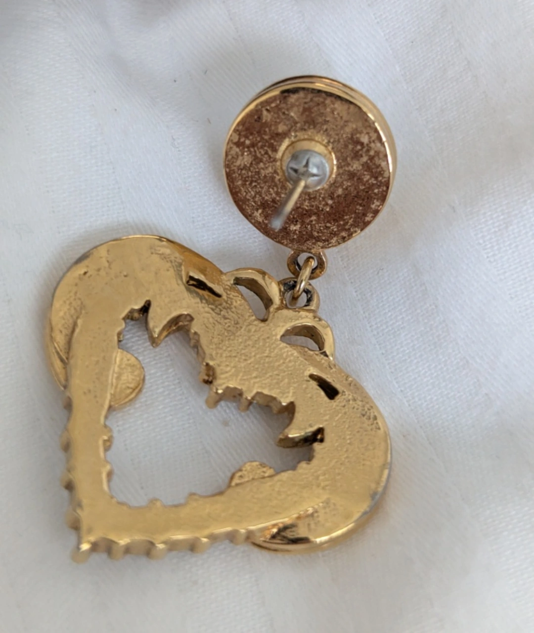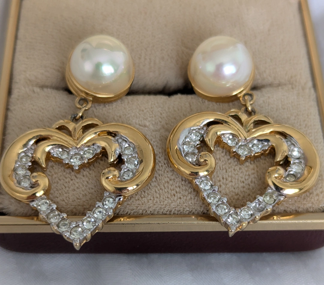 Beautiful pair of gold tone dangle earrings. Features a large pearl at the top and a detailed heart-shaped design with clear crystals. Elegant and eye-catching.