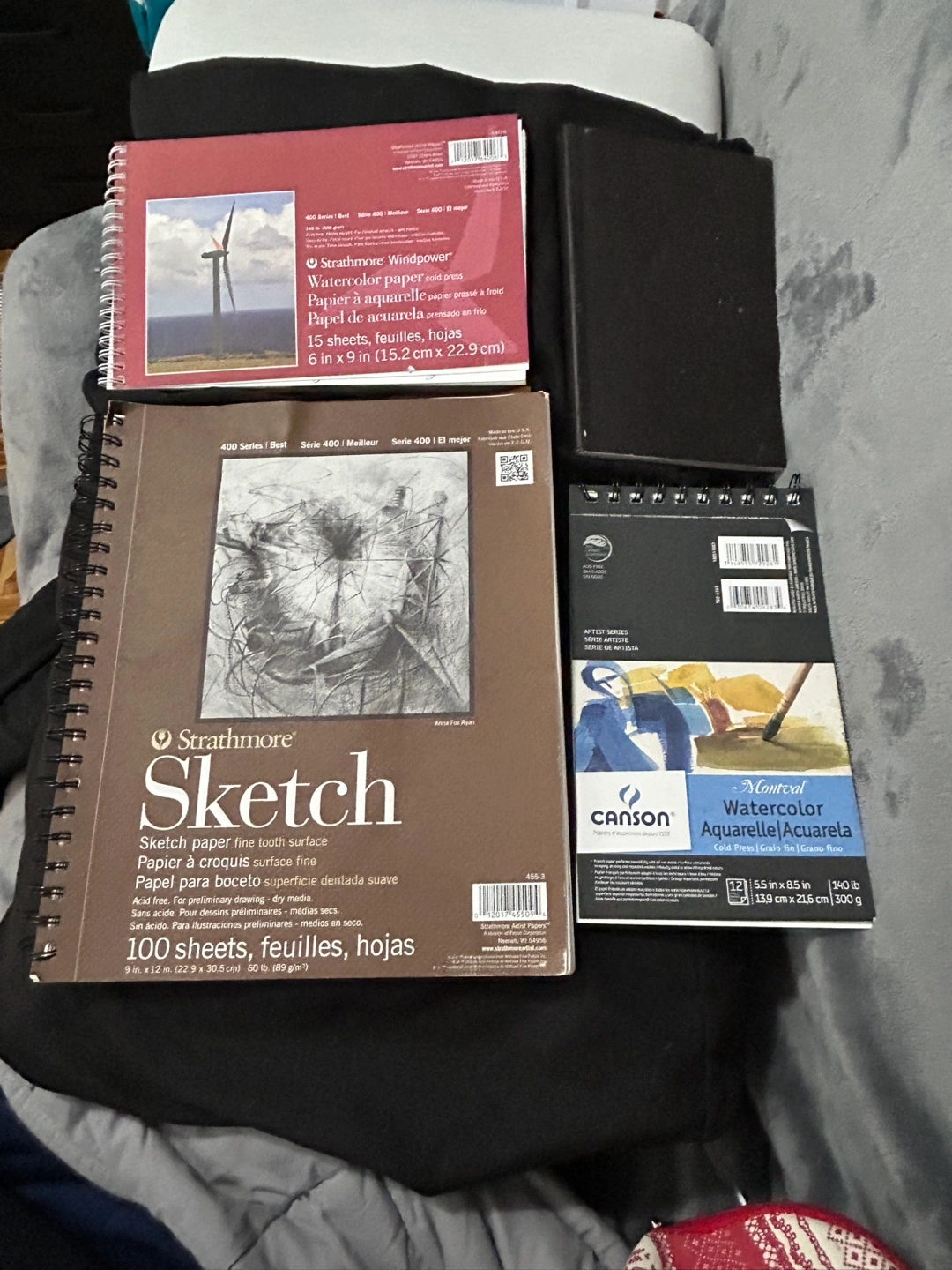 Set of three sketchbooks and one watercolor pad. Includes Strathmore Windpower watercolor paper, Strathmore Sketch paper, and Canson Montval watercolor paper. Various sizes and weights.