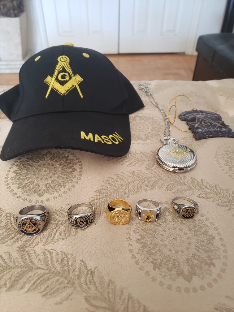 Black baseball cap with Masonic symbol and MASON embroidery. Five Masonic rings, various metals. Silver pocket watch on chain. Masonic pendant. Collectible set. $60 for all 8 items, or 10 each.