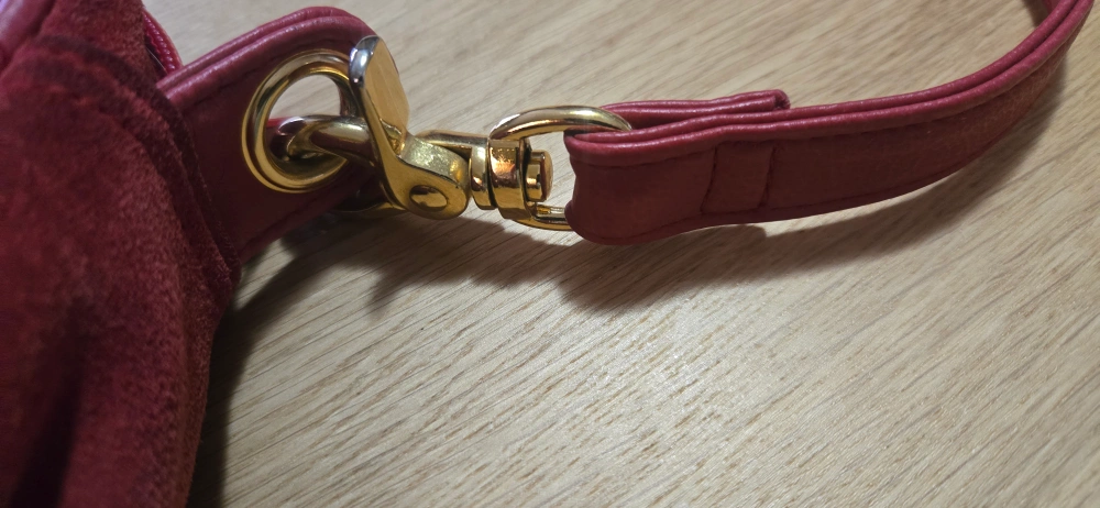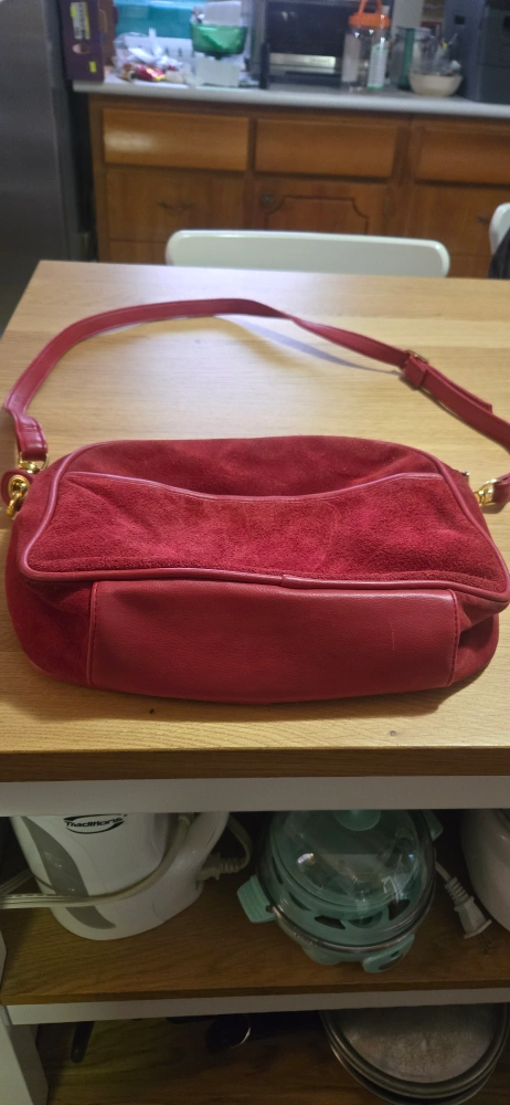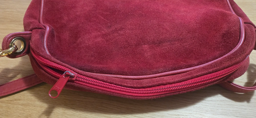 Red suede crossbody bag. Features gold-toned hardware. Adjustable strap. Zipper closure. Interior zipper pocket. Pre-owned.