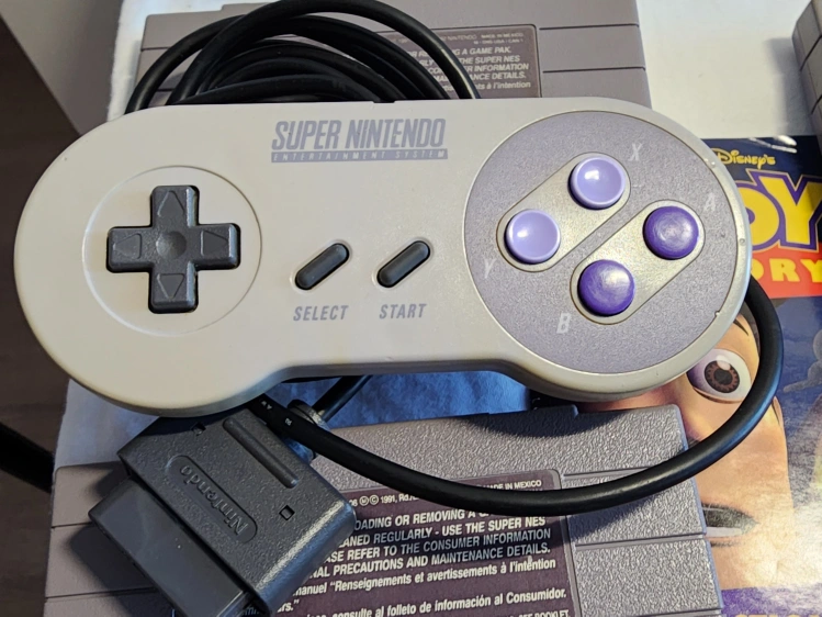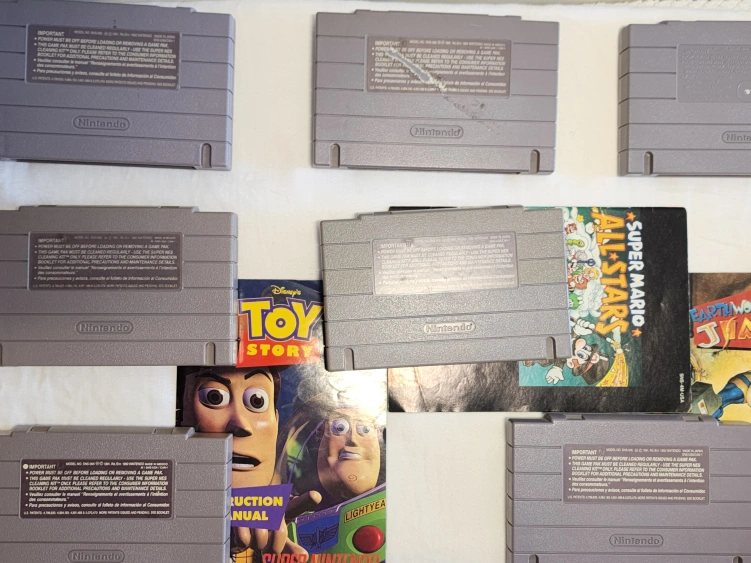Collection of Super Nintendo game cartridges, some with manual and also a controller.