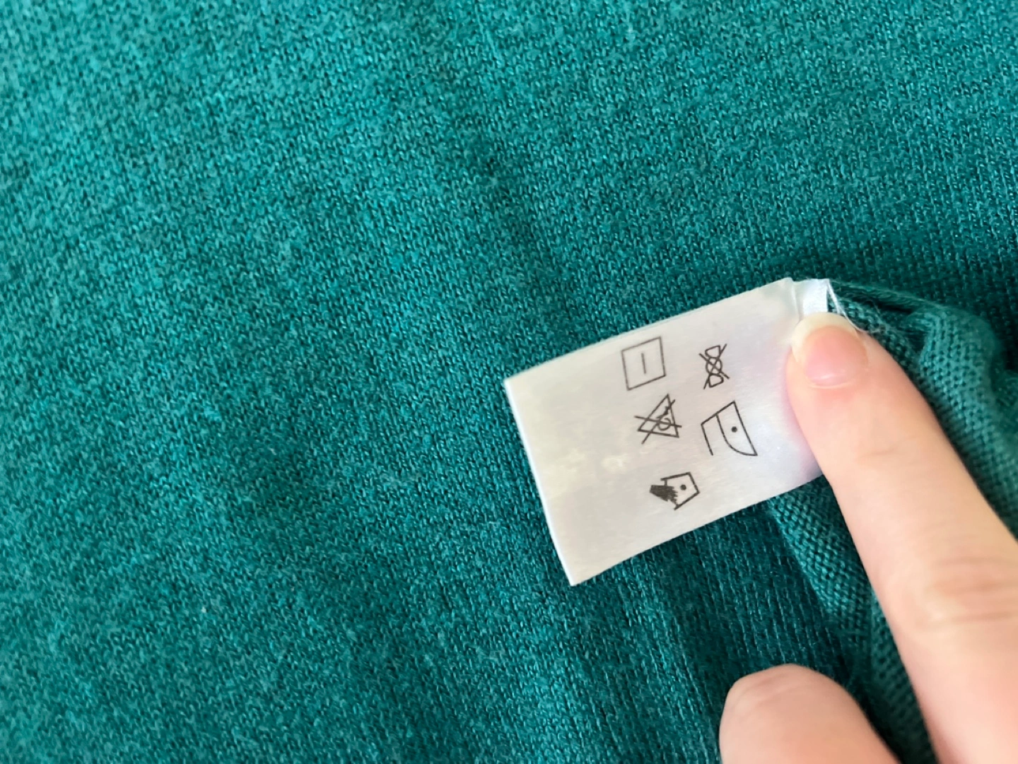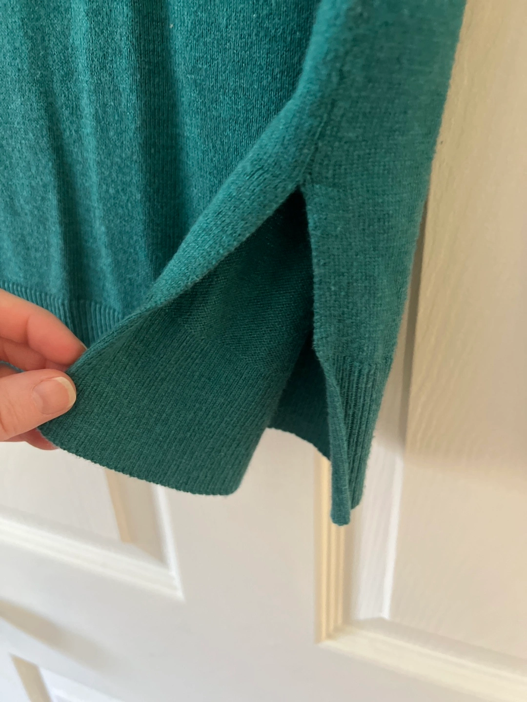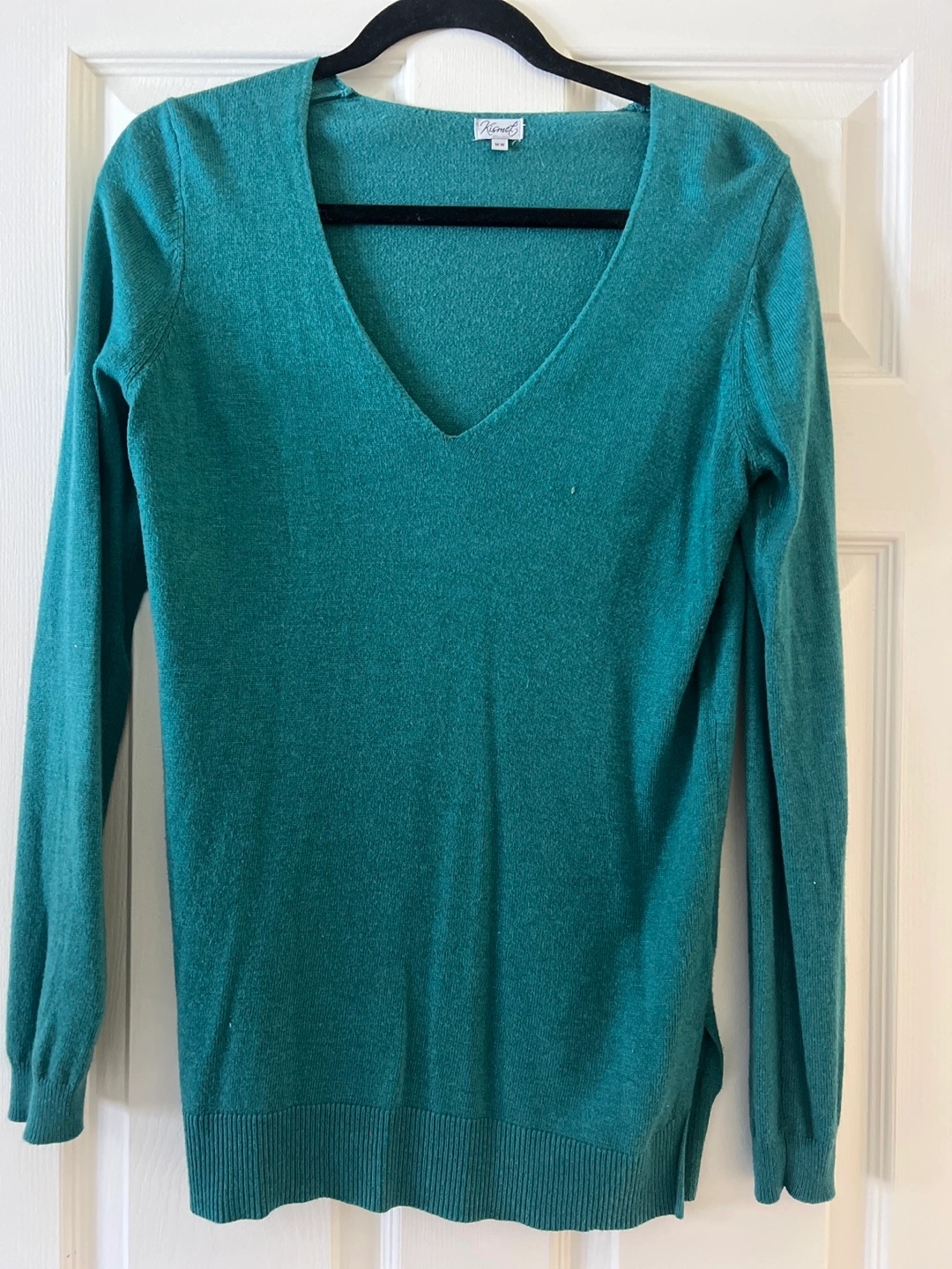Women's teal v-neck long-sleeved sweater. Medium size. Made in Laos. 40% nylon, 40% rayon, 20% cotton. Soft and comfortable knit fabric. Simple style, perfect for layering.