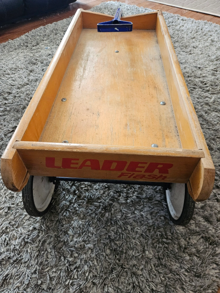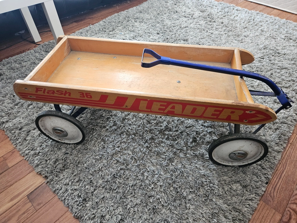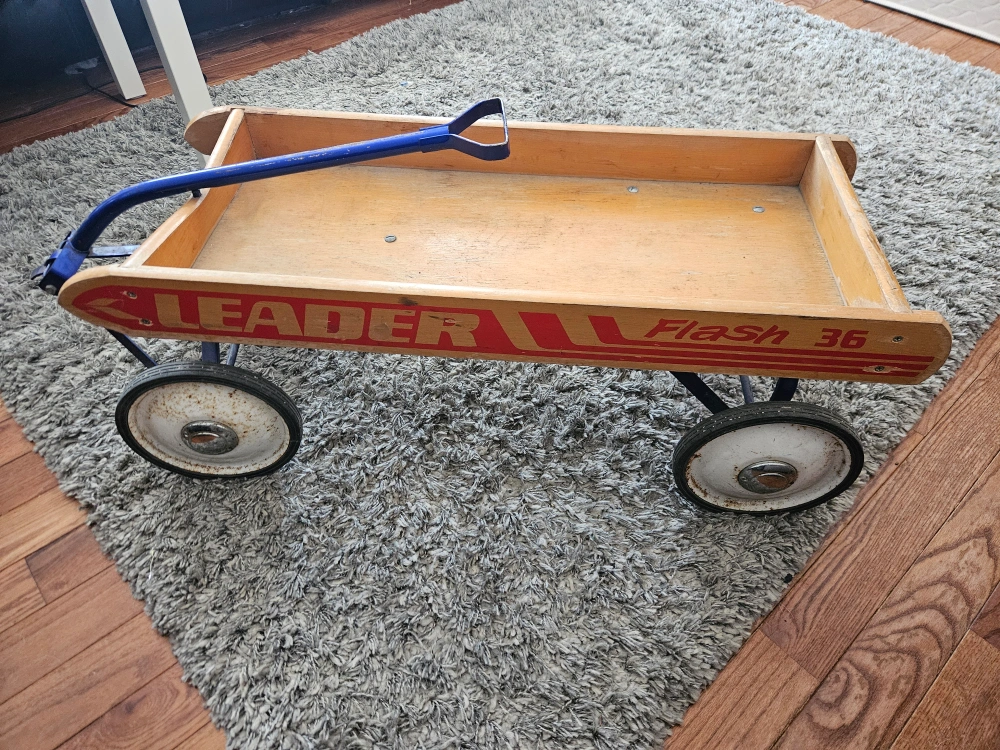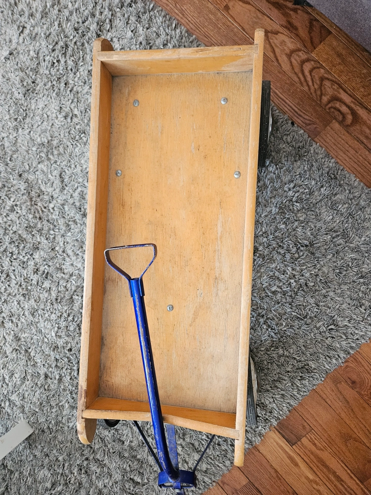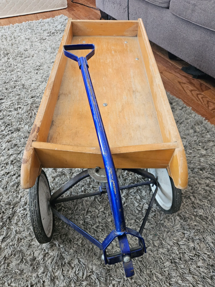 Vintage wooden wagon. Features a blue handle and four wheels. Shows some wear from age and use. Great for restoration or display.