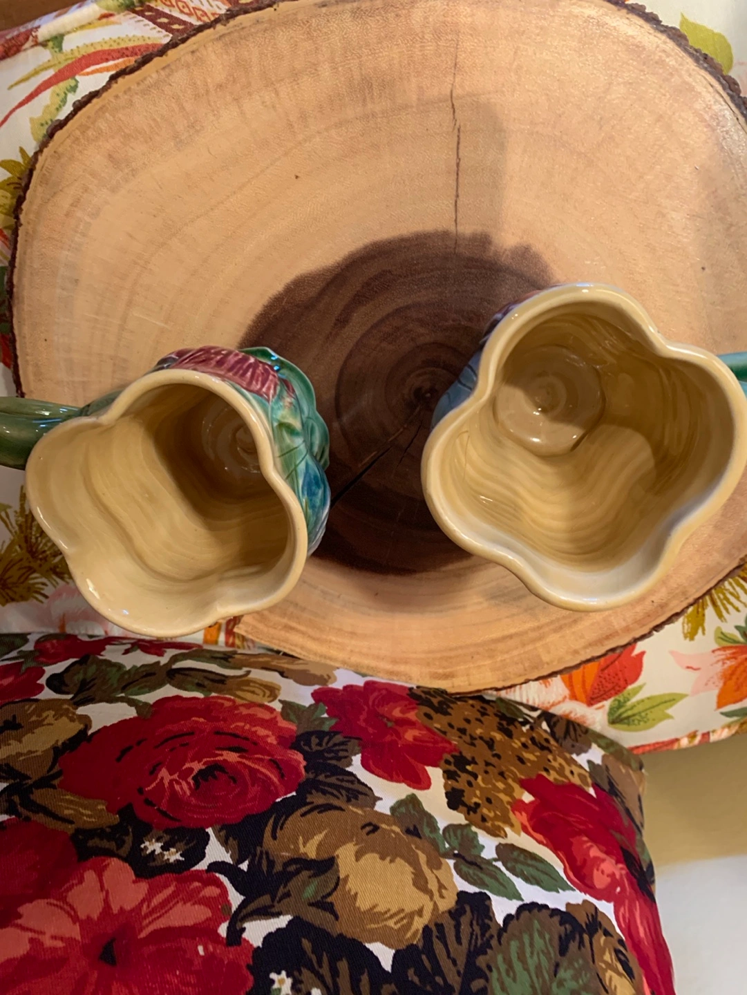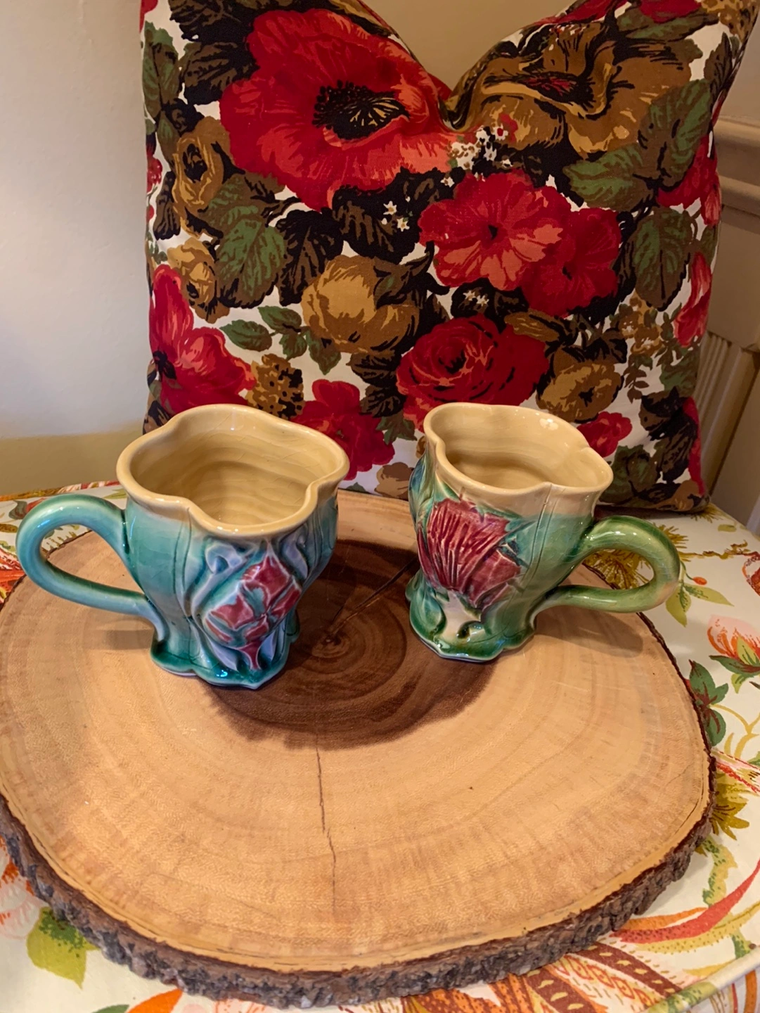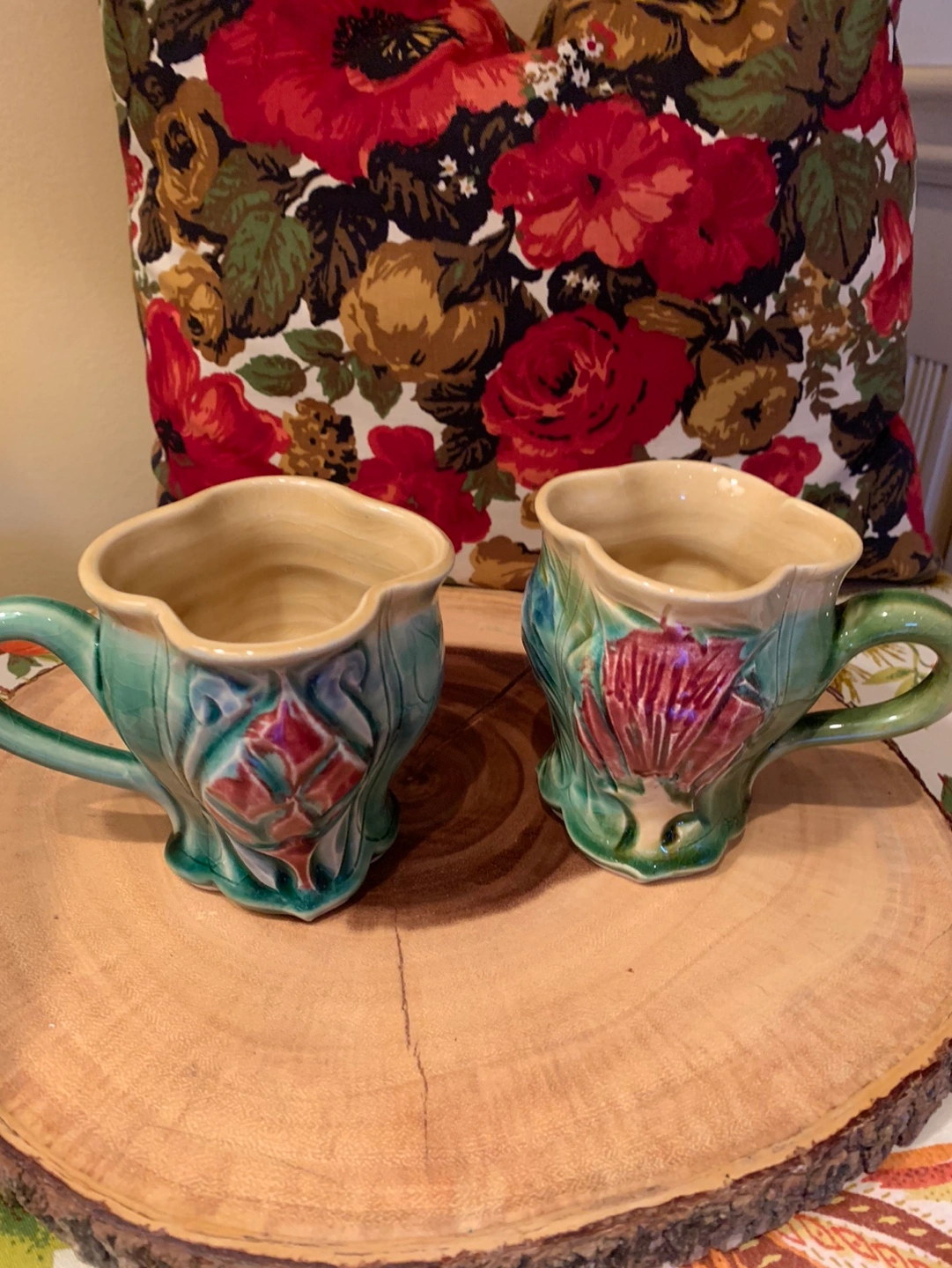 STUNNING pair of unique vintage ceramic mugs with an intricate floral design. Hand-painted, Artisan-made and signed by the artist. Lovely colours in muted yellow, burgundy, green and a touch of blue. They measure 4” tall and 5” wide to the handle. Perfect for tea or coffee and would look gorgeous on display in the kitchen. This is a rare pair for sure!