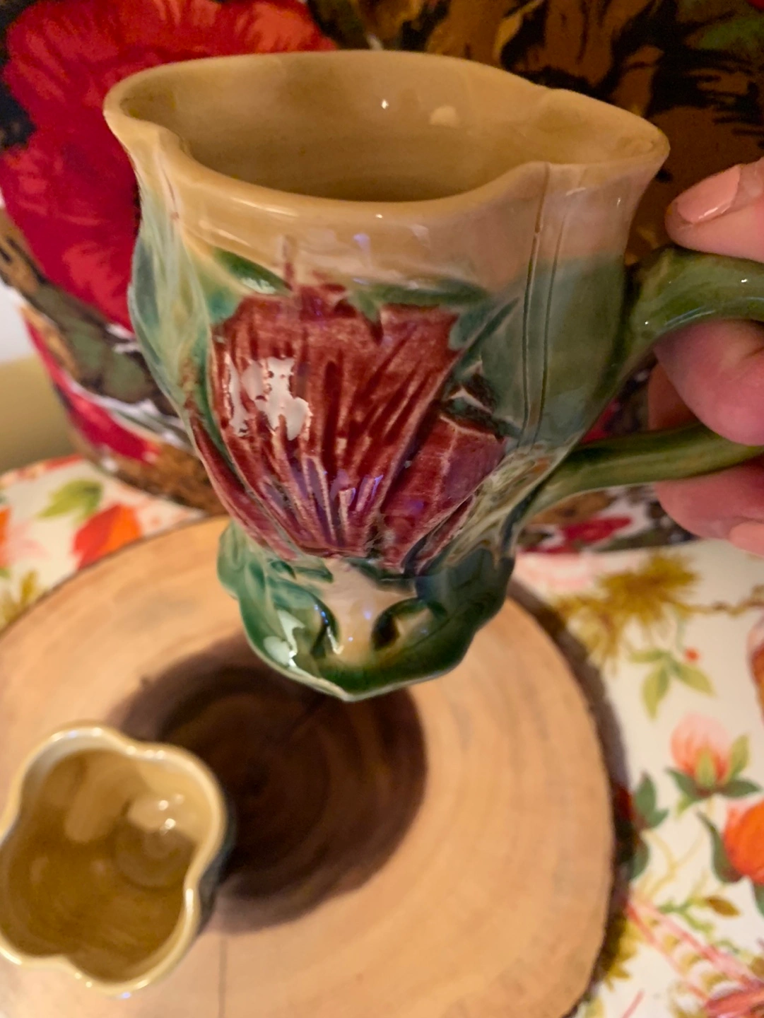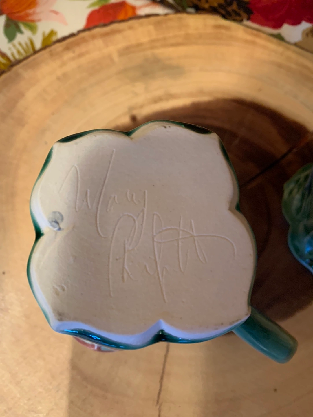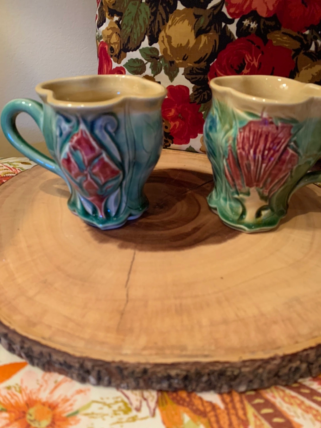 STUNNING pair of unique vintage ceramic mugs with an intricate floral design. Hand-painted, Artisan-made and signed by the artist. Lovely colours in muted yellow, burgundy, green and a touch of blue. They measure 4” tall and 5” wide to the handle. Perfect for tea or coffee and would look gorgeous on display in the kitchen. This is a rare pair for sure!