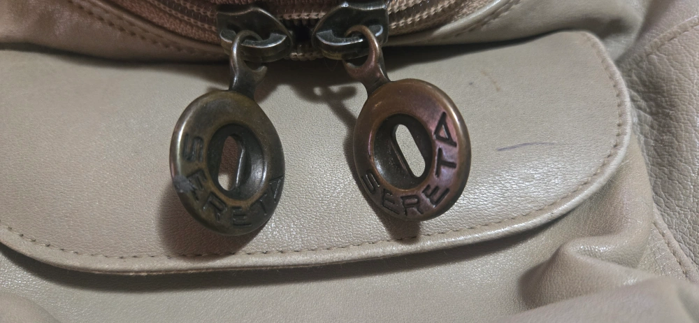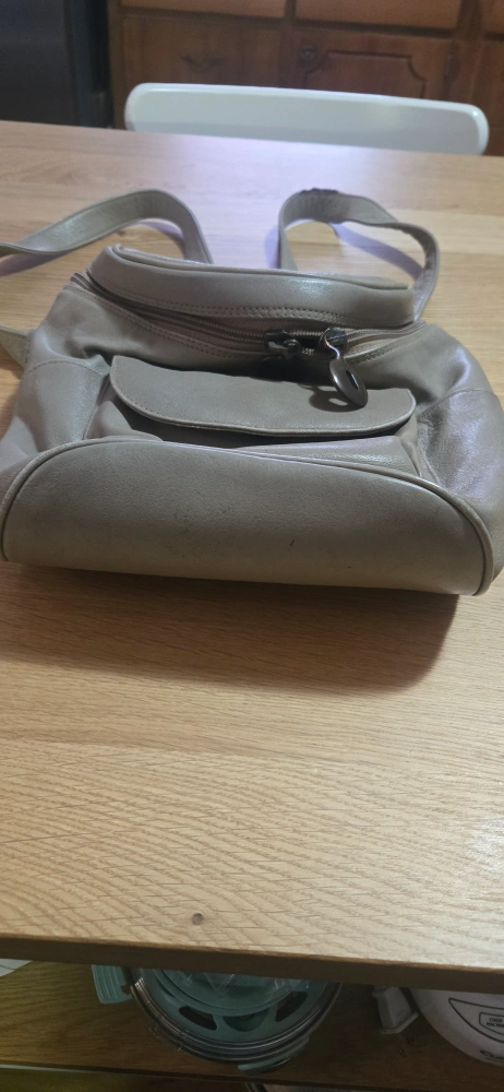 Taupe leather backpack purse. Zipper closure. Outside snap pocket. Adjustable straps. Minor wear.