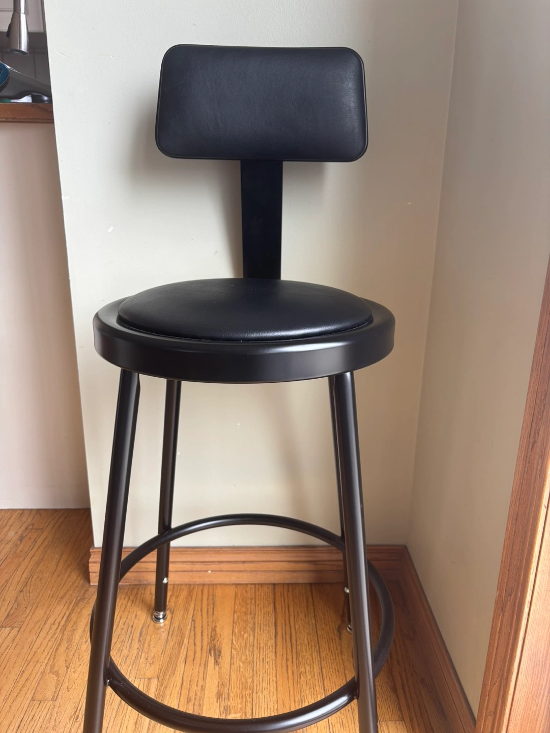 Black metal adjustable height stool. Features a padded backrest and seat. Great for kitchen or workspace.
