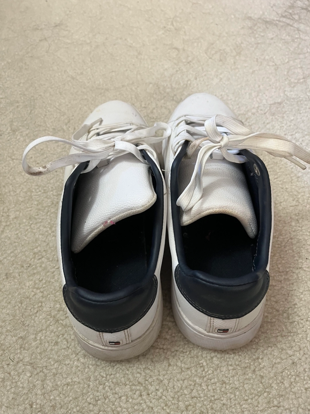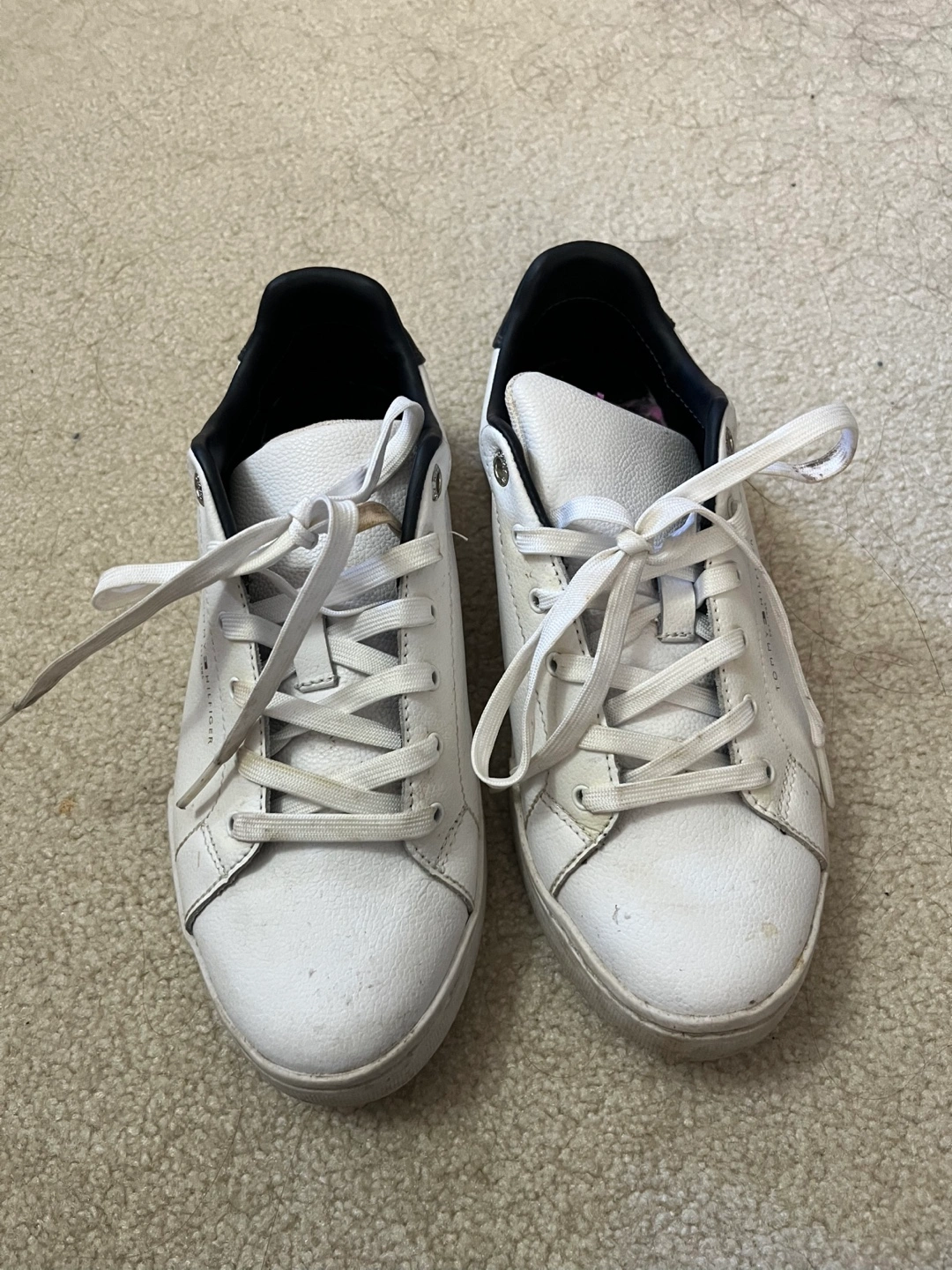 Women's white leather sneakers. Lace-up closure. Navy blue accents. Lightly worn.