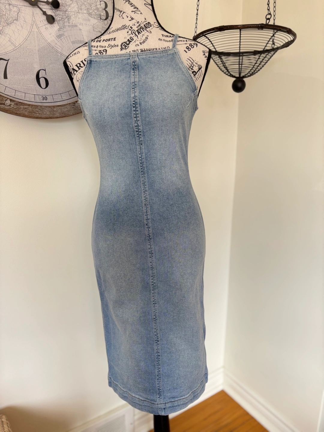 Light wash denim dress. Features a sleeveless apron design and a back zipper. Midi length. Great for casual wear. It is an XS but will fit a small frame. Retails for $224. Asking $160 since it’s new with tags. Cash only.
