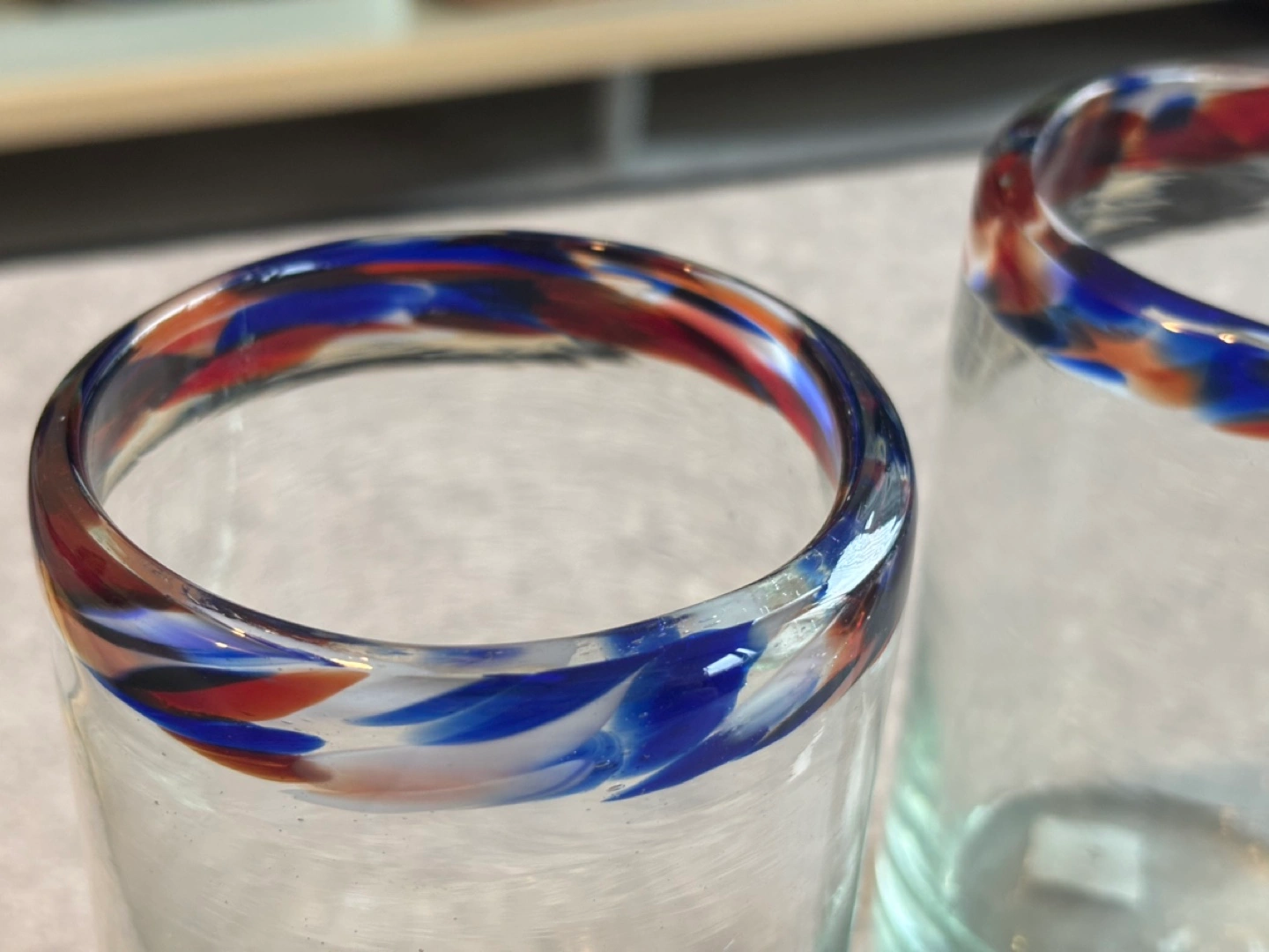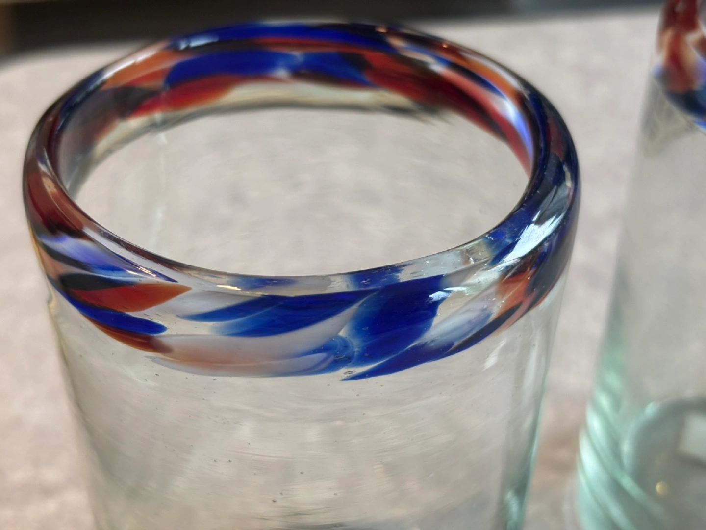 Set of two glasses. Handblown in Mexico. Features a colourful rim detail. Great for water or other beverages.