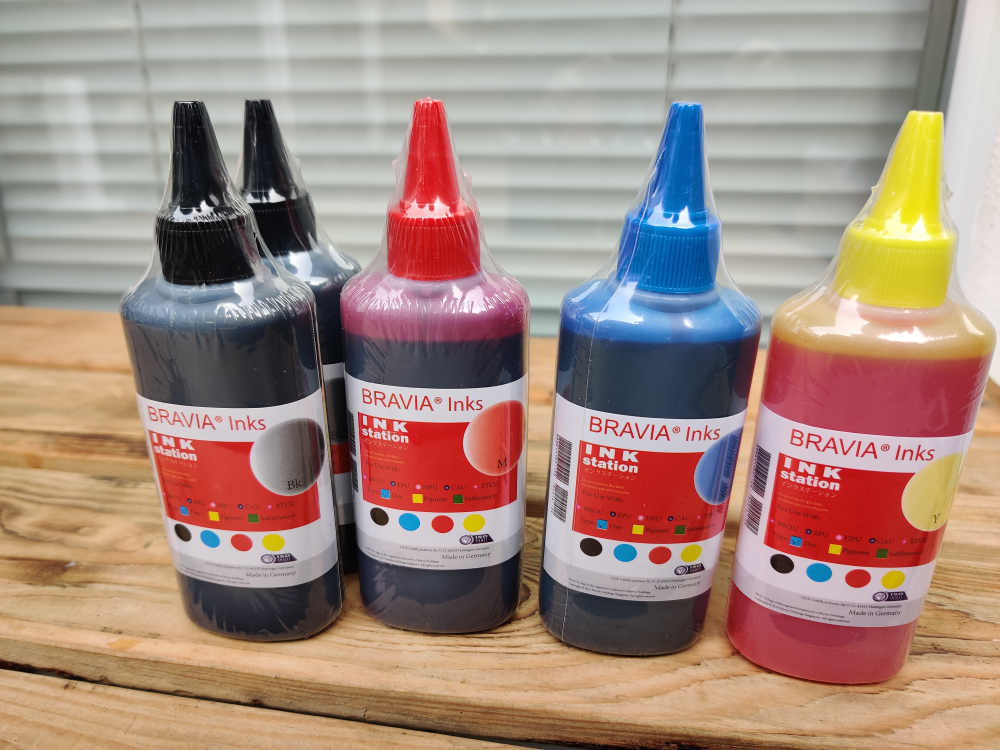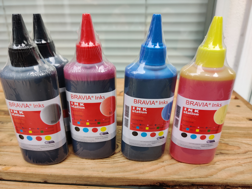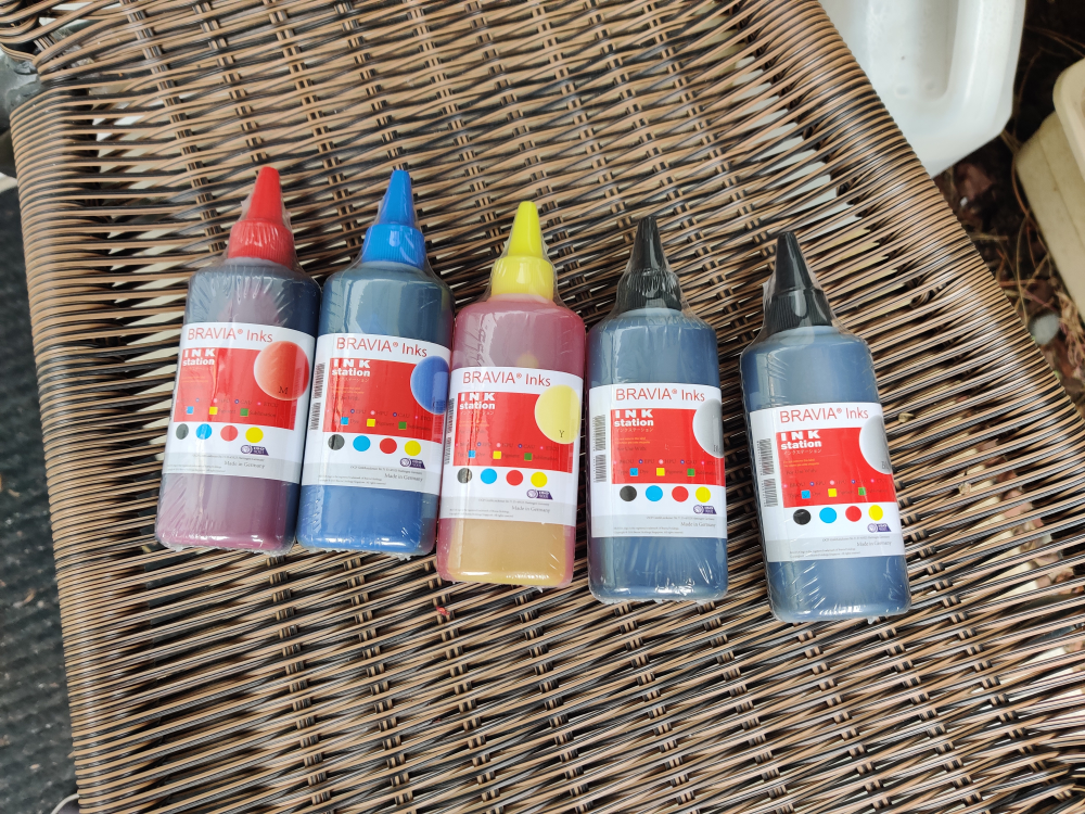 Five bottles of Bravia Ink Station inks. Colours include magenta, cyan, yellow, black(2x). 100ml/each bottle universal.