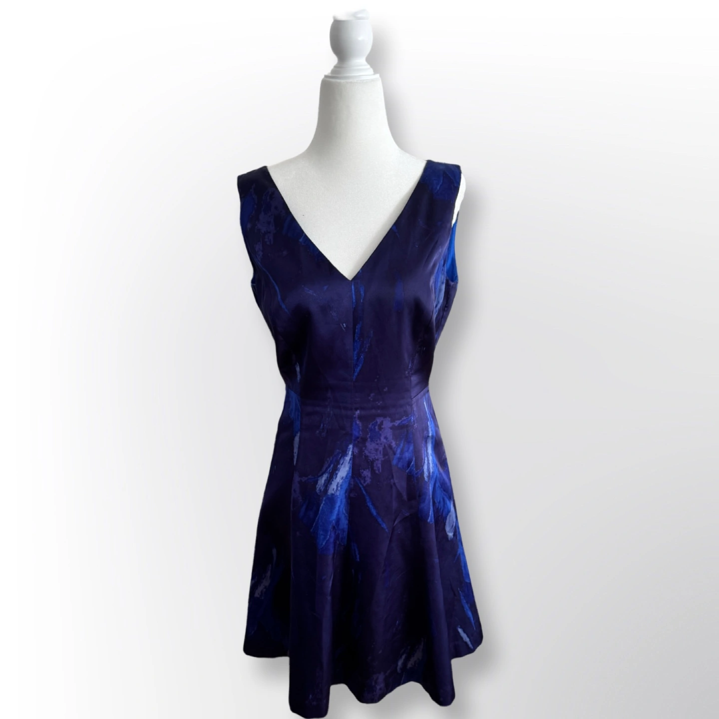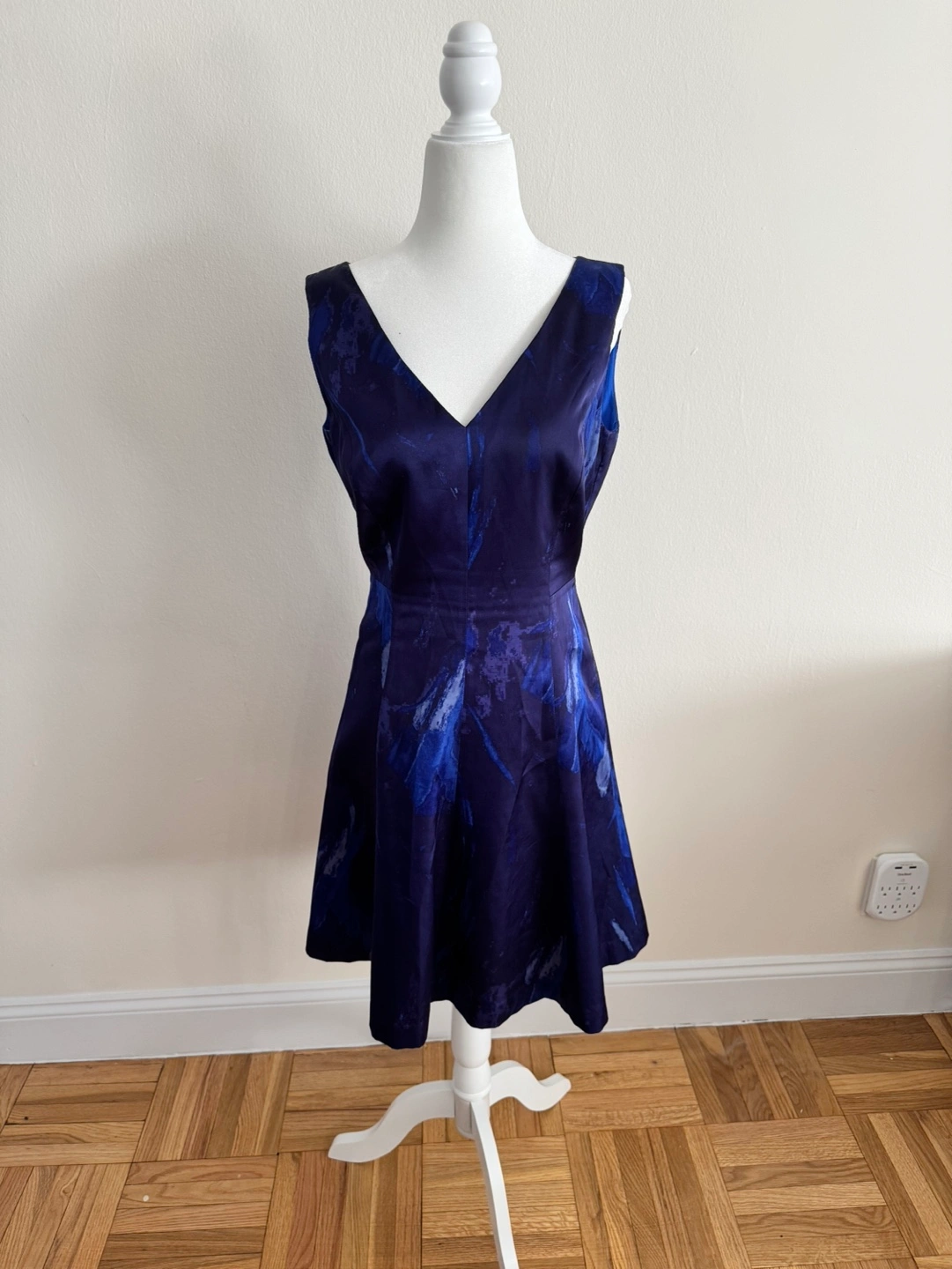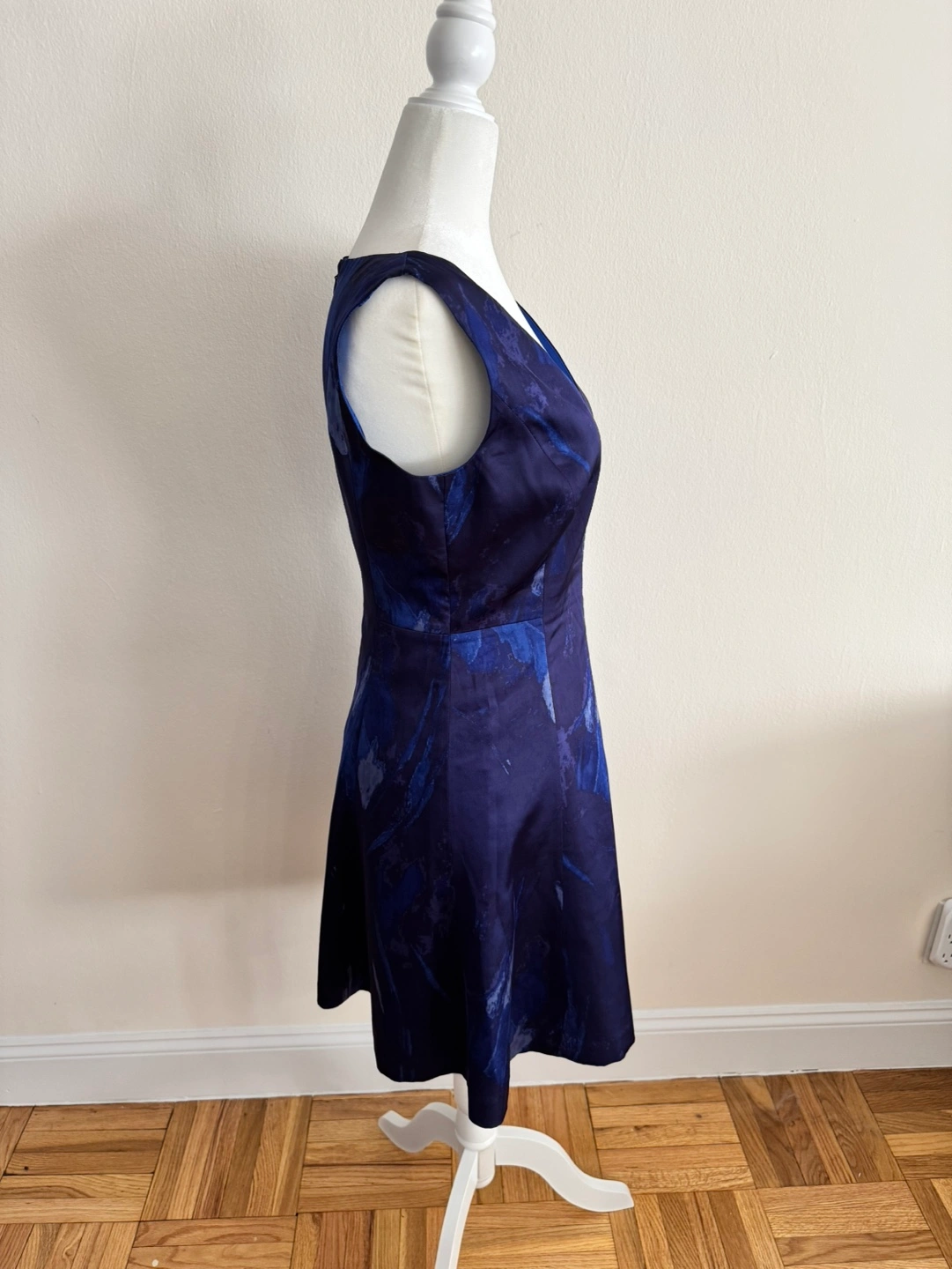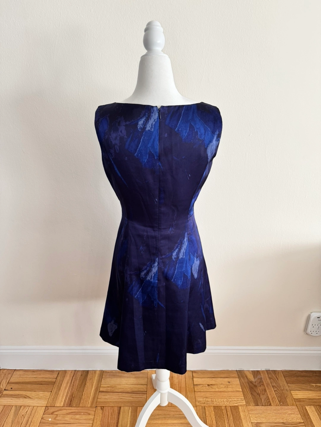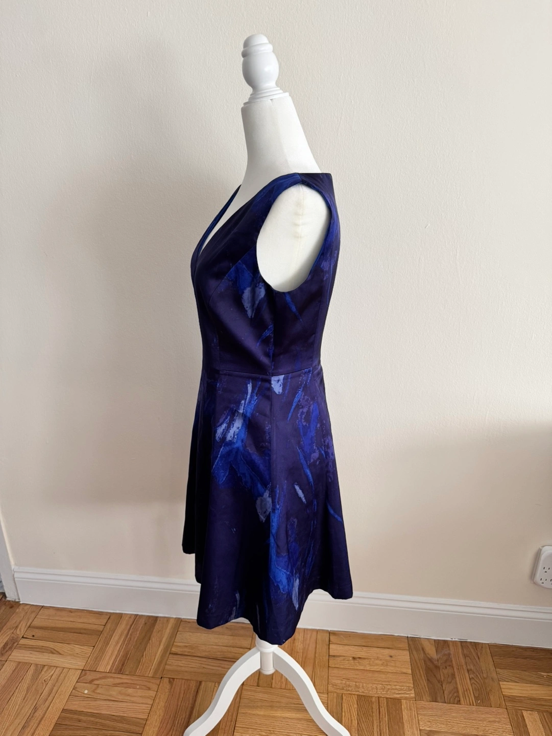 Stunning navy blue sleeveless fit and flare dress. Abstract print throughout. Hidden back zipper. Perfect for any occasion.