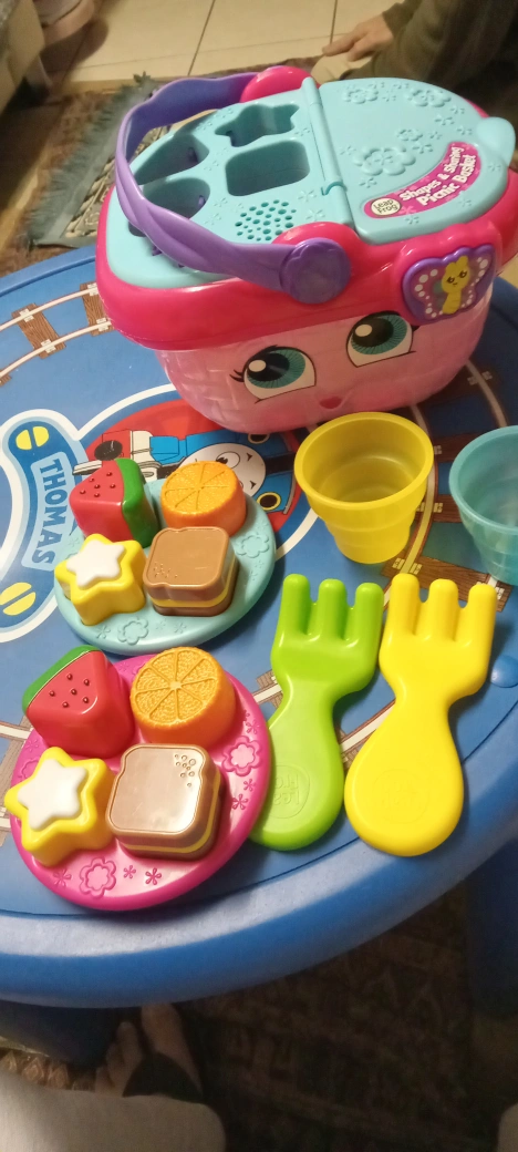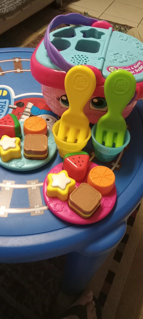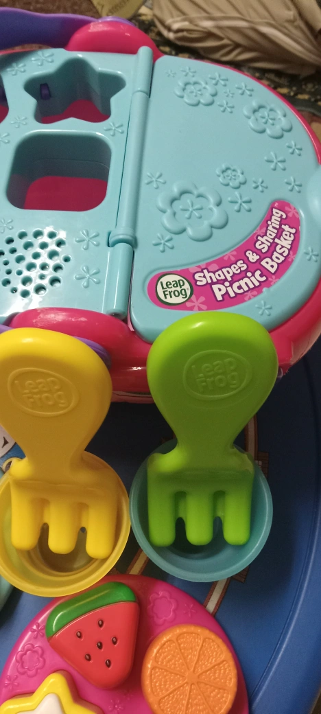 564Pre-owned LeapFrog Shapes & Sharing Picnic Basket. Includes basket, plates, food pieces, utensils, and a bonus LeapFrog learning tablet. Great for imaginative play and early learning. I am trying to sell all of plz if interested plz msg me thankyou an advance