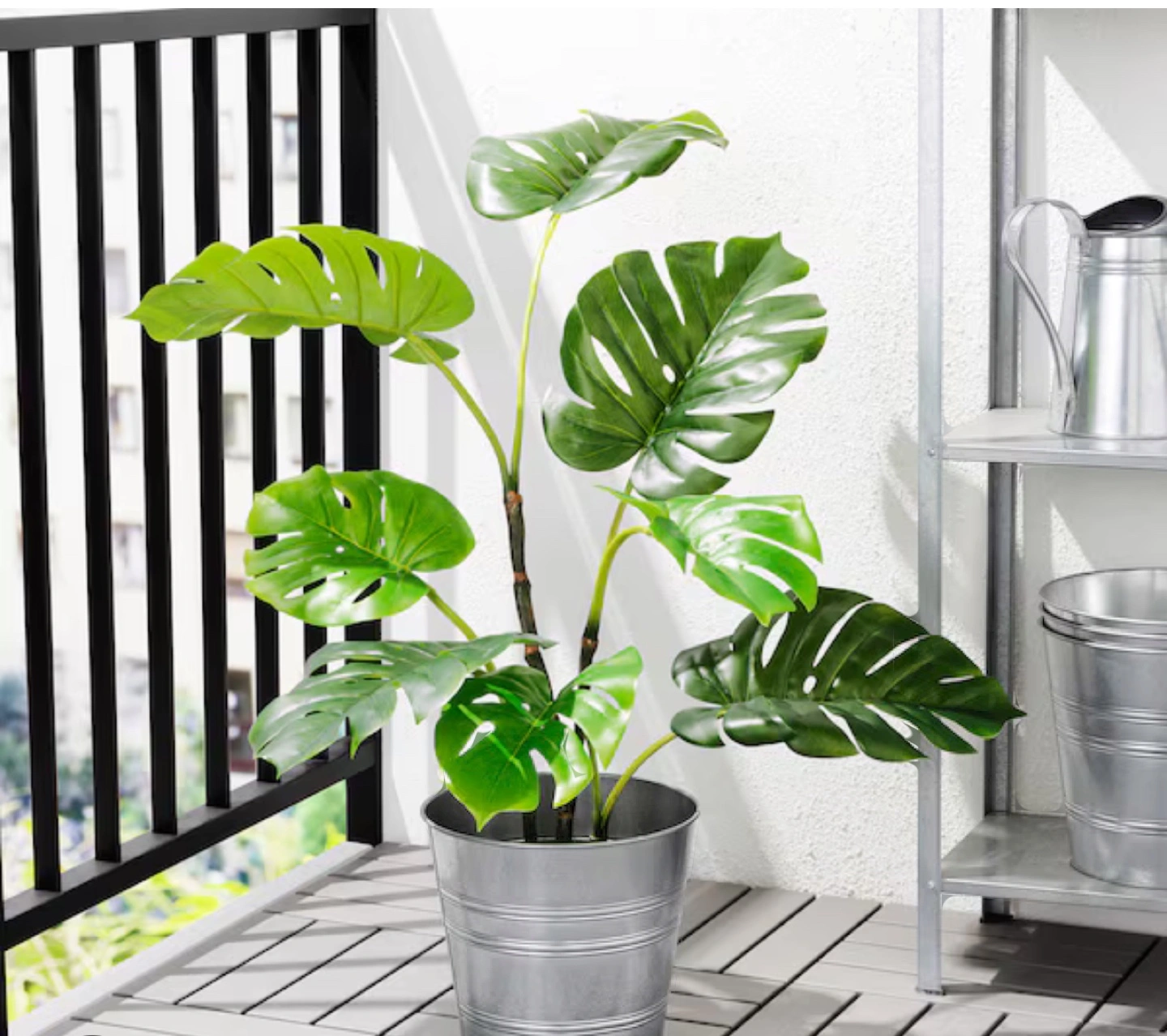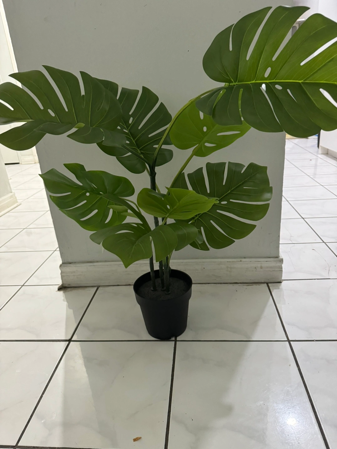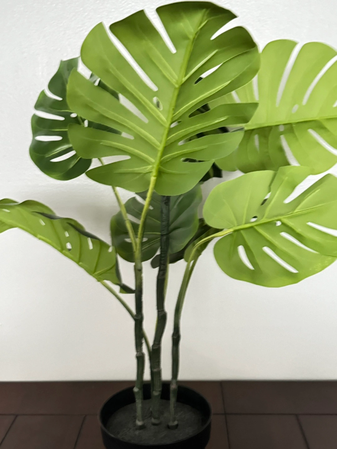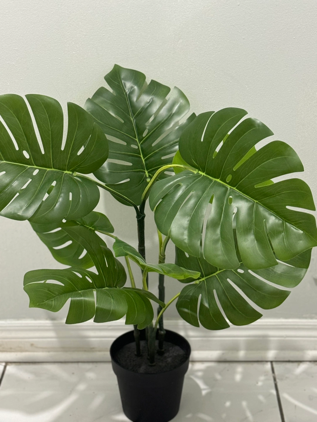 Artificial Monstera plant. Several large leaves. Planted in a small black pot. Looks realistic.