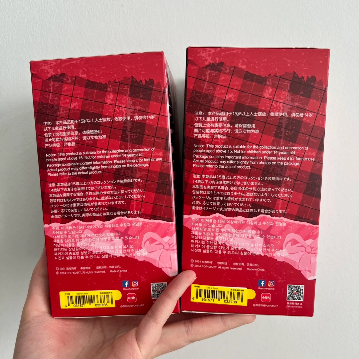 Two Skullpanda Winter Symphony Series plush toys. New in box. Collectible item. Adorable design. Pink and red colour scheme.