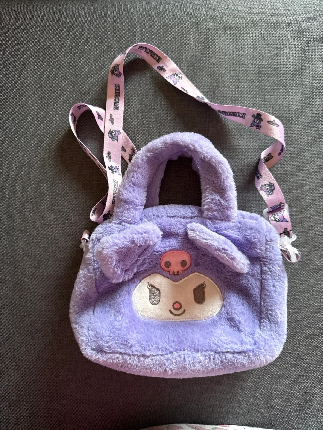 Adorable purple plush bag. Features Kuromi face and detachable strap. Small size, perfect for essentials. Zipper closure.