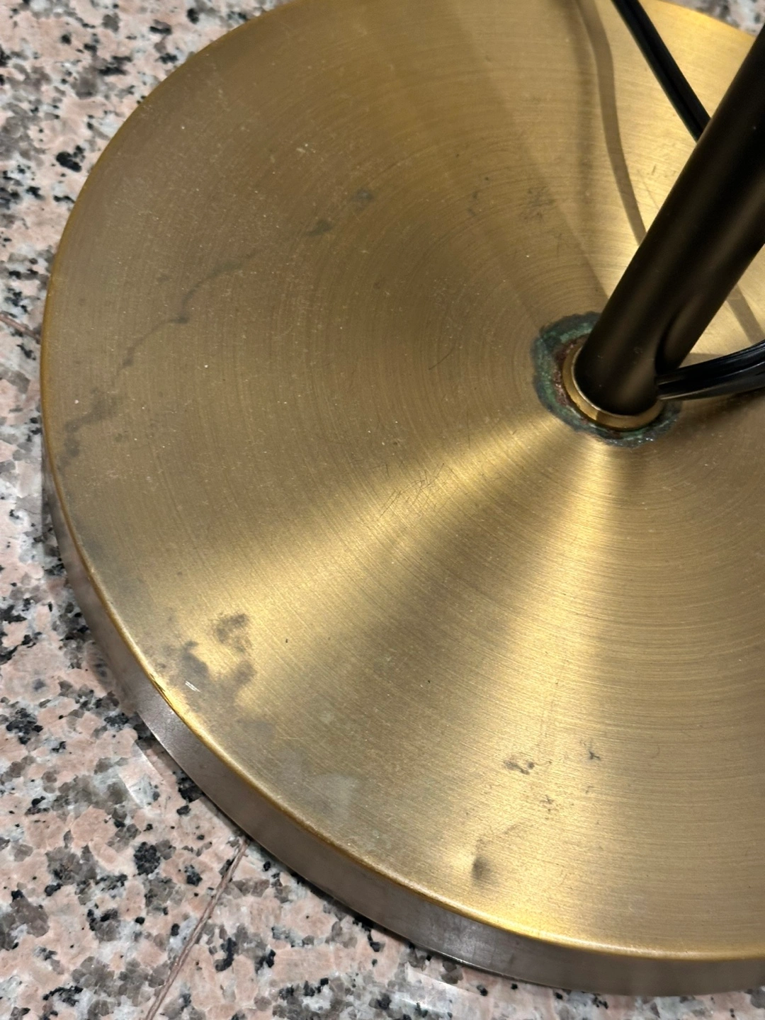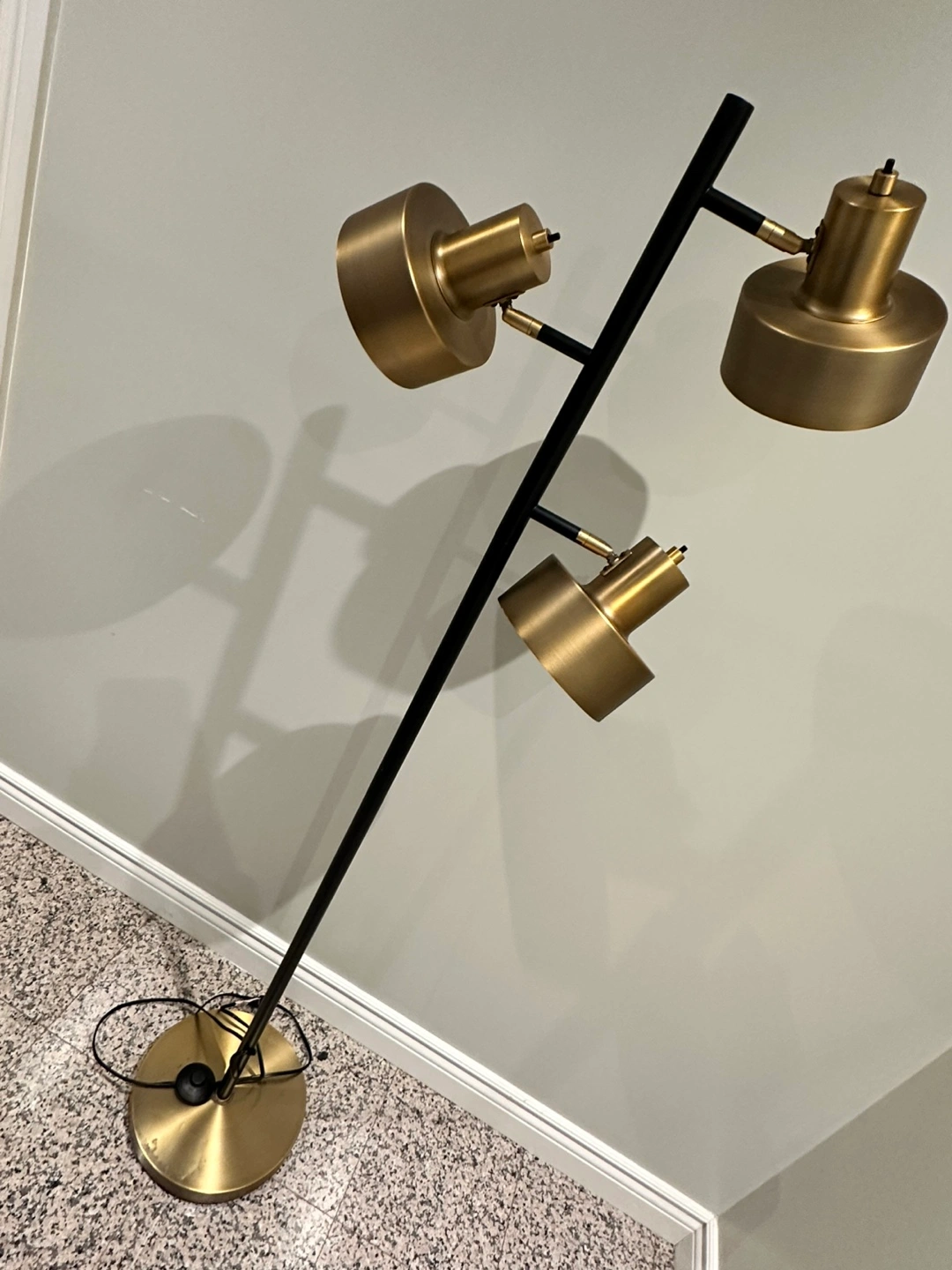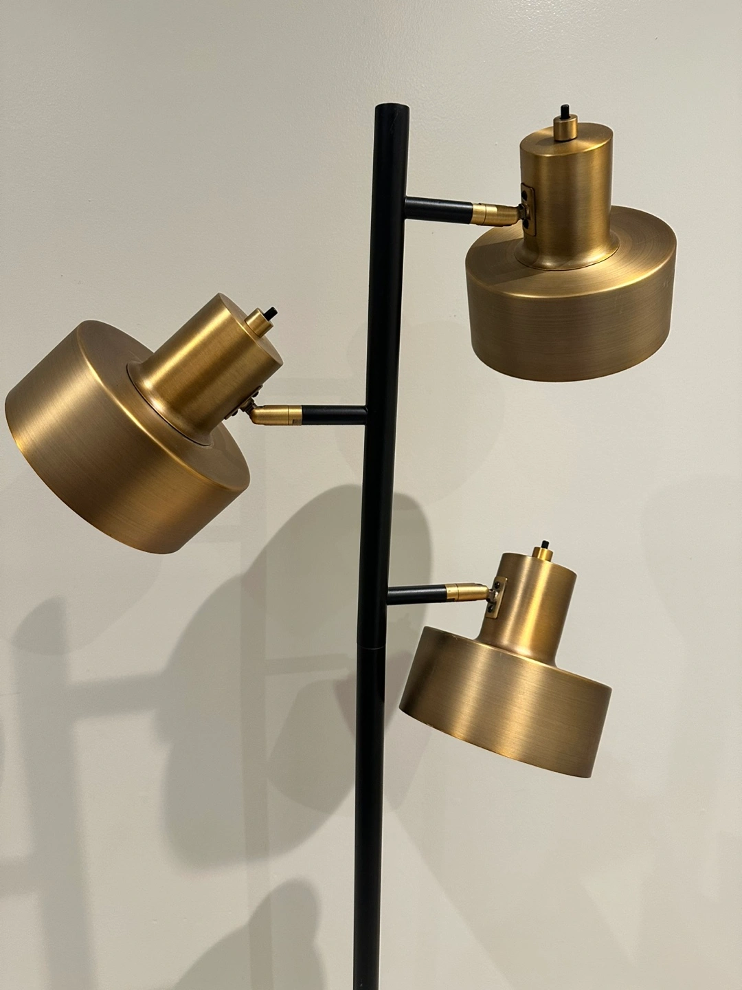 123Modern floor lamp. Three adjustable brass shades. Black metal pole. Gold coloured base. Minimalist design. Great for living room or bedroom. Minor wear and tear at the base.