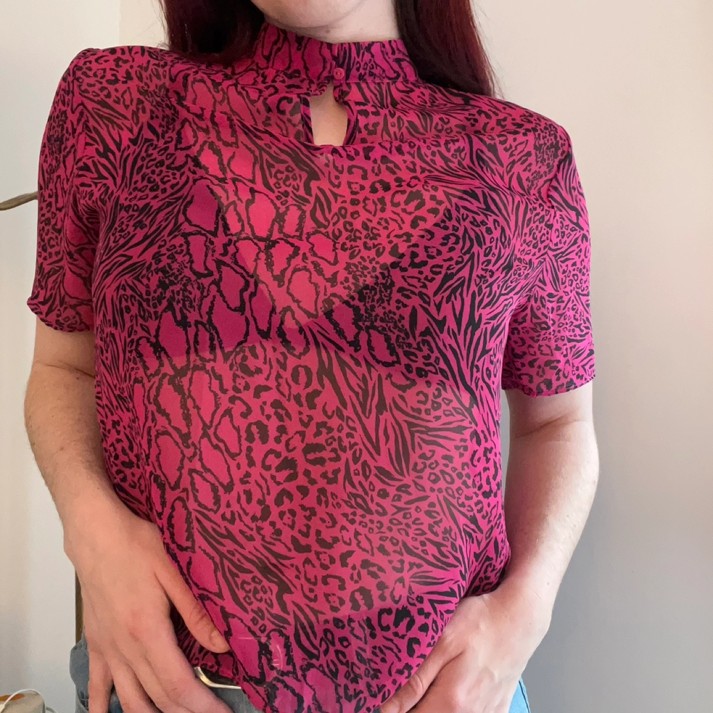 Stand out with this vibrant pink leopard print top this summer. It’s punk rock meets office wear with a flowing quality to the material and no defined waist. The button at the back of the neck allows for multi wear use to change up the style of how you wear the shirt.