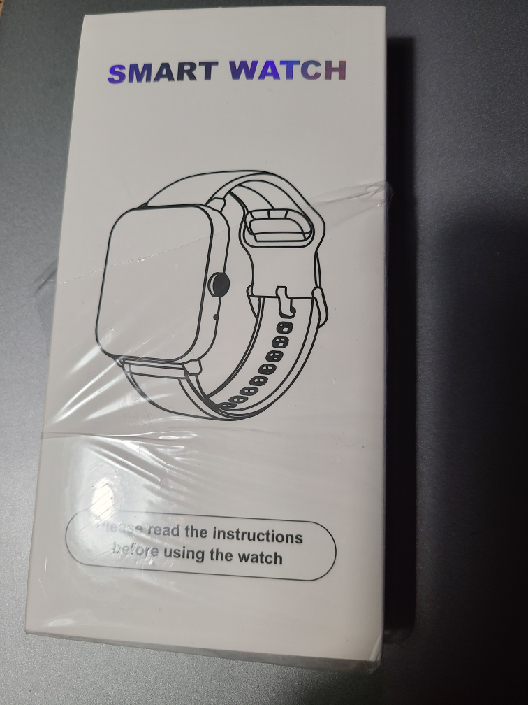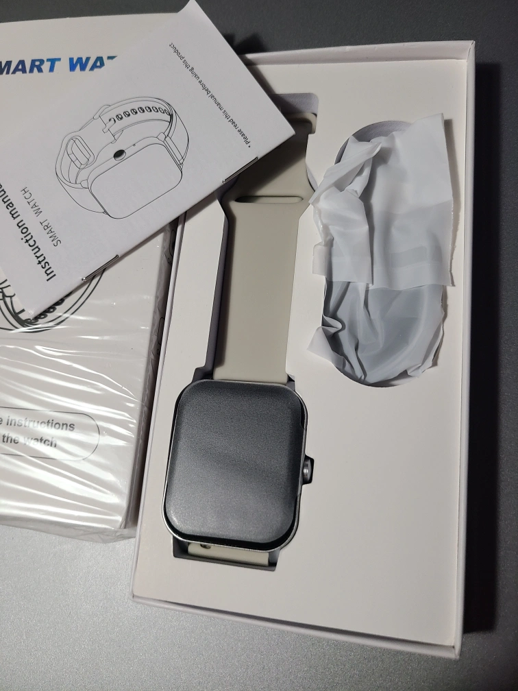 Brand new, never used smart watch. Square face, circular button, beige silicone band. Includes instruction manual. Boxed.