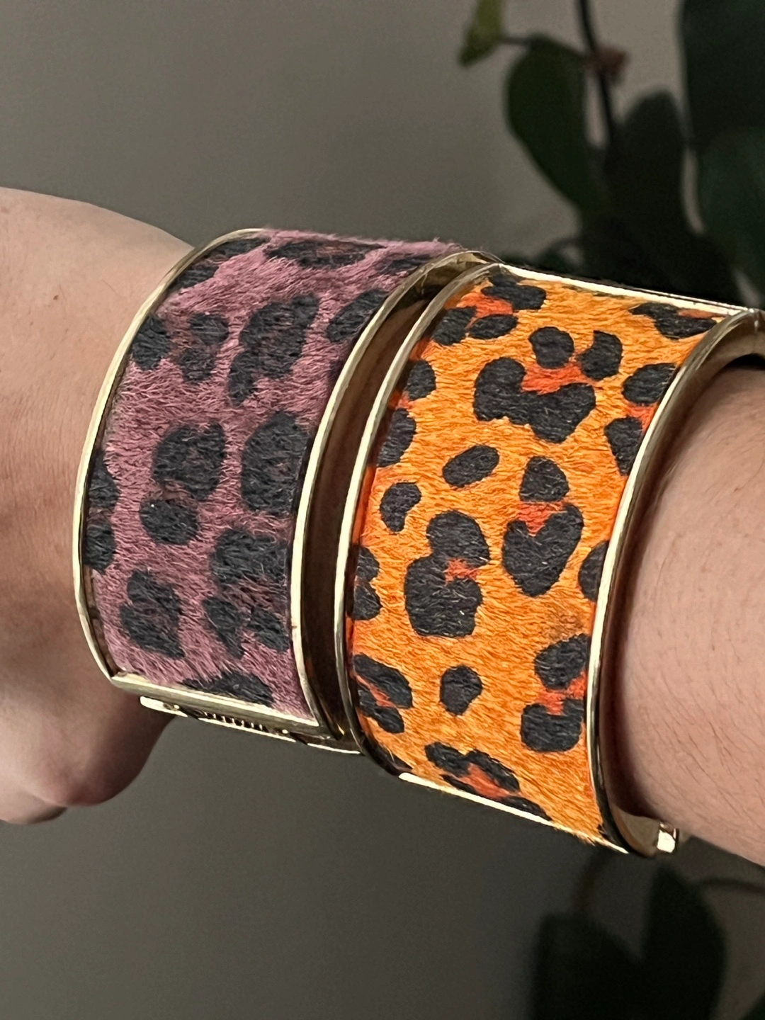 Selling a pair of gold-toned metal cuff bracelets. One features a mauve leopard print, the other an orange leopard print. Great for layering or wearing individually.