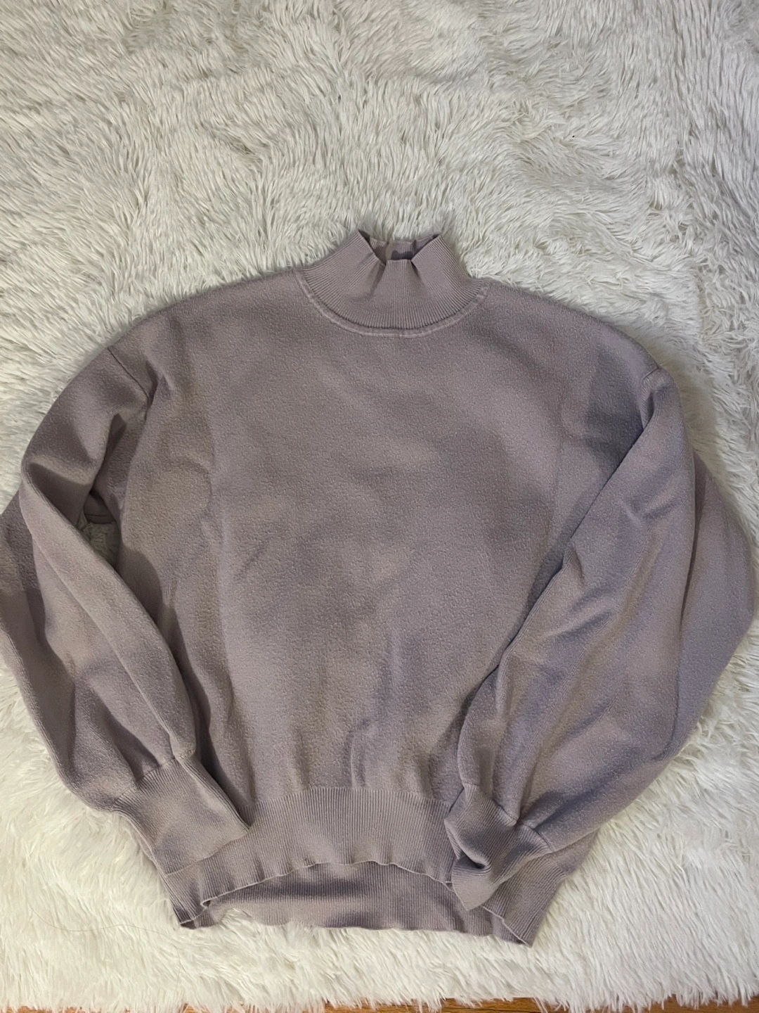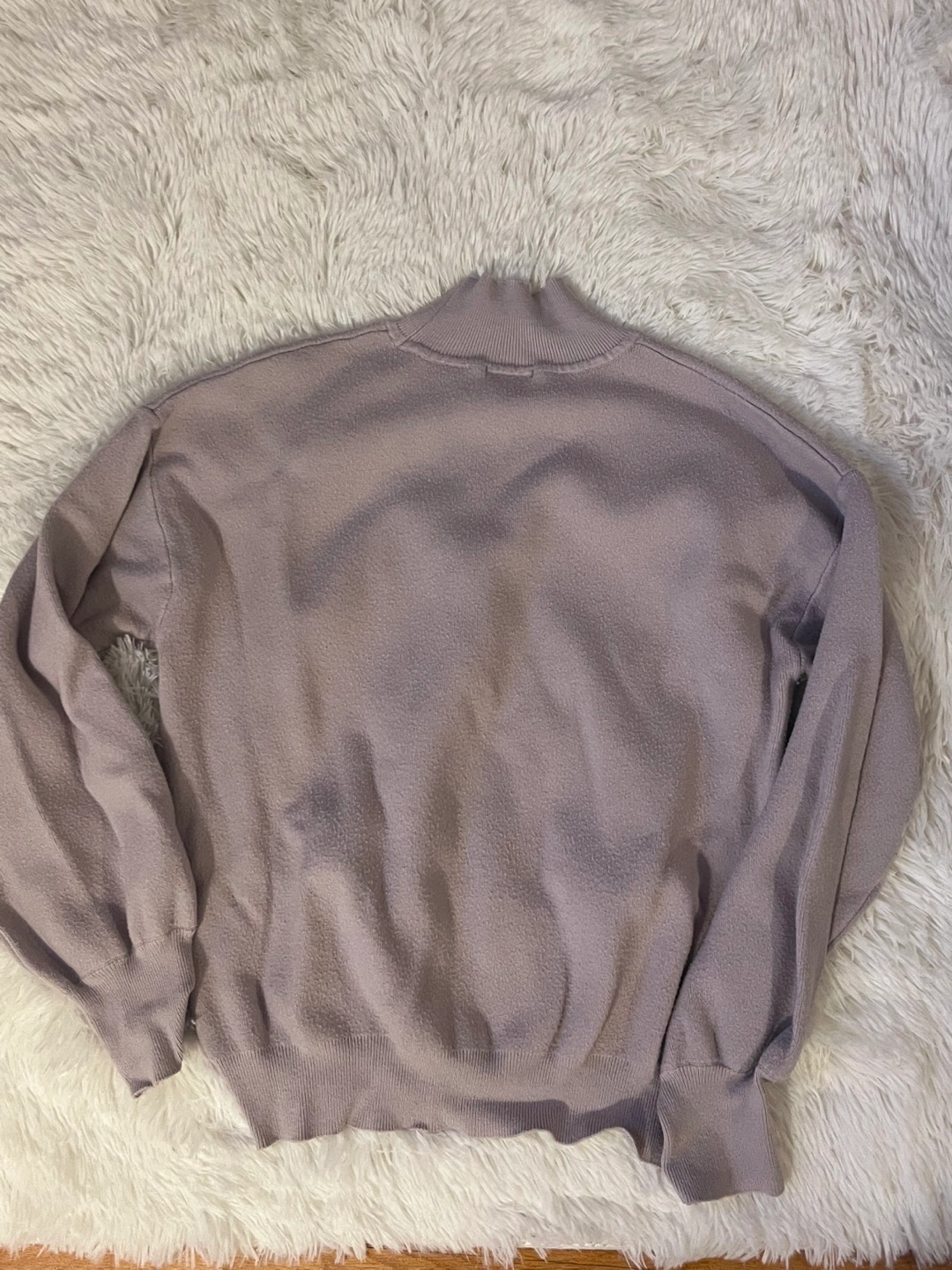 53Soft mauve mock neck sweater. Long sleeves, relaxed fit. Good for layering or wearing alone. Size large. chest: 52cm length: 56cm sleeve: 48cm