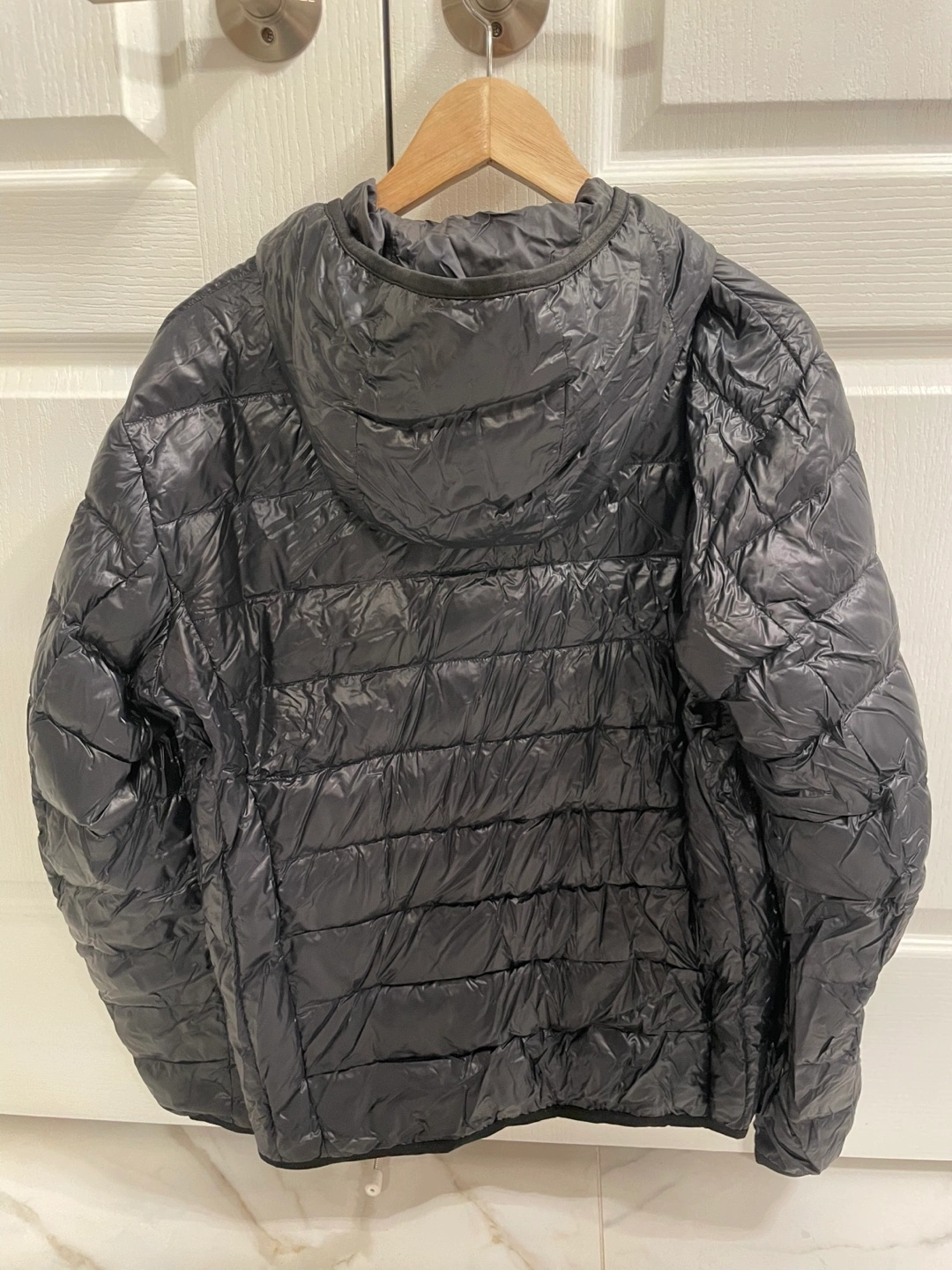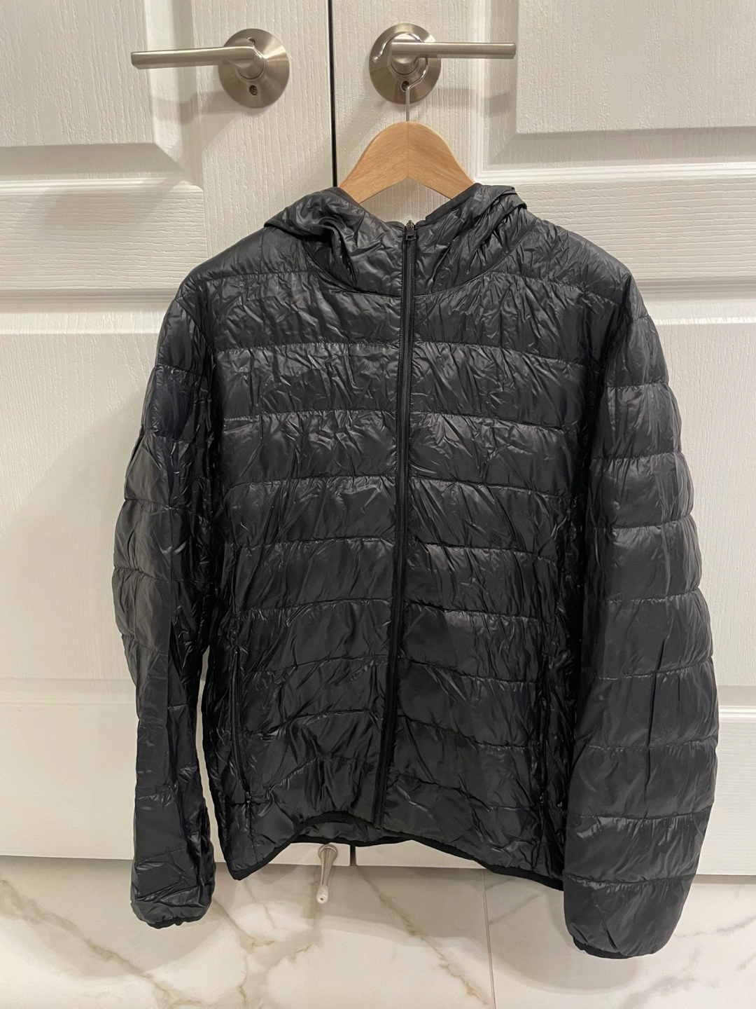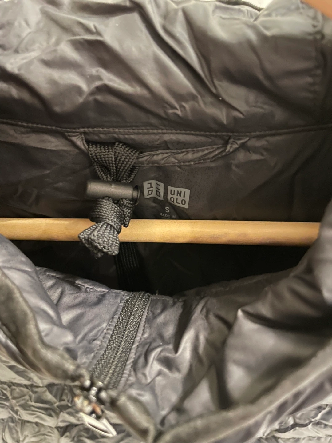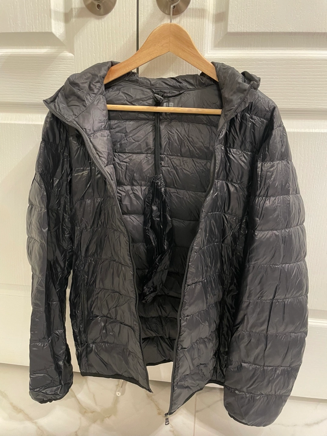 Black Uniqlo ultra light down jacket.